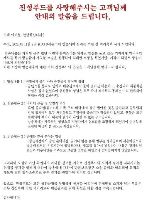 내용이 매우 고압적입니다. 협박조입니다. 악의적 제보이고 악마적 편집이기 때문에 법적 조치를 취하겠다고 합니다. 머리 숙여 사죄드린다는데, 그 이유가 그런 방송이 나왔기 때문입니다. 다시 말해 방송이 안나오게 해야 하는데 막지 못해서 사과드린다는 겁니다. 그런 방송 내용으로 놀랐을 소비자들, 그런 제품을 먹었을 지도 모르는 소비자들에 대해 미안해한다거나 사죄하는 내용은 없습니다.