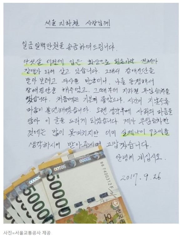 #서울교통공사 #70대 #사과편지 #100만원