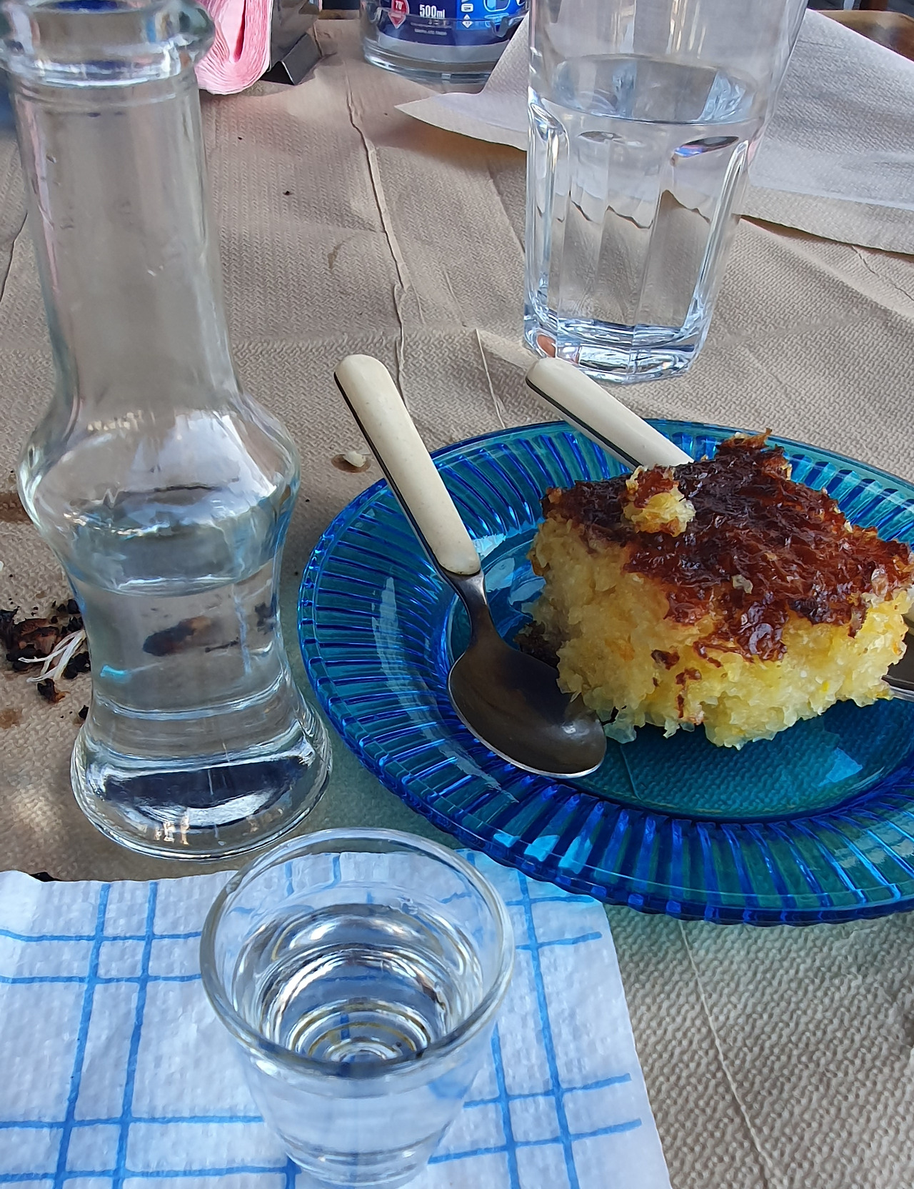 유럽 사람들은 반주가 생활화되어있고, 마찬가지로 그리스 음식을 더 맛있게 만들어주는 것은 술이다. 실제 우리가 갔던 곳들 대부분이 'taverna'였는데 구글링 해보면 콜린스 사전은 다음과 같이 설명하고 있다 - 'a small, inexpensive tavern or restaurant in Greece, often with music and dancing'. 내 식대로 표현하자면, 판타지 게임을 해보면 'tavern'이 술집으로 번역되듯, 가볍게 술을 곁들여서 식사를 할 수 있는 대중식당이다. 마지막 식당에서 내가 맥주 마시게(결국 고른 건 와인이었지만) 드링크 메뉴를 달라고 하니 유쾌한 식당 주인장 왈 "너는 나보다 더 그리스 사람 같아"란다. 아무래도 이 분이 한국인의 주류 사랑을 잘 모르셨던 모양이지만 유럽 사람들은 낮술도 많이 마시니, 음주 빈도 면에서는 우리보다 한 술 더 뜰지도 모른다. 남편이 옛날 그리스를 다녀와서 계속하던 말이 그리스에서는 와인을 피쳐로 놓고 마신다는 거라서 꼭 한번 해보고 싶었던 터라, 화이트 와인 1리터를 주문했는데 아쉽게도(?) 500밀리리터 물병 두 개에 나왔다. 어려운 그리스어가 생산자명이라는 걸 보면 가게에서 주조하는 것은 아니고 통 단위로 사서 파는 모양이다. 맛은 깔끔한 편이라 저렴한 가격에 부담 없이 마시기 좋았다. 비슷하게 그리스 마트에도 2유로 안쪽의 저렴한 화이트 와인을 팔고 있는데 풍미는 약하지만 부담 없이 요리에 쓰거나 곁들일 수 있어서 좋았다.