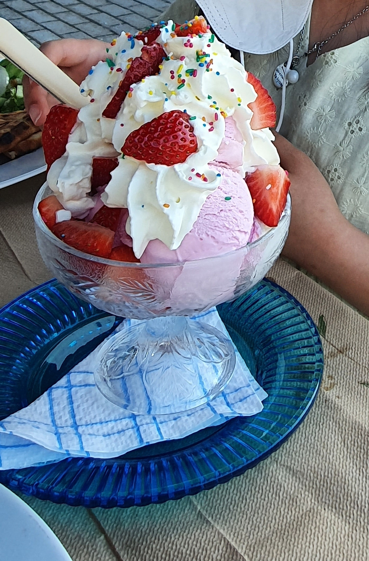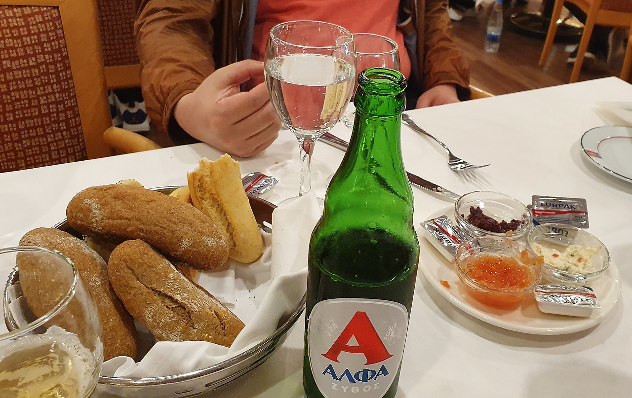 야간 페리에도 식당이 있다. 주차 후 위층으로 올라가면 바로 밤바다를 볼 수 있는 스낵바가 나오기 때문에 크레타로 갈 때는 여기서 먹는 실수를 했는데, 알고 보니 제대로 먹을 수 있는 레스토랑도 옆에 있어서 본토로 돌아갈 때는 레스토랑에서 먹었다. 가격은 합리적인 수준인데, 다만 빵을 기본으로 주고 1인당 2.5유로씩을 받았다. 어쩐지 빵 구성이 너무 좋은데 그냥 주는 게 이상하다 했더니 계산서에 떡하니 적혀있는 7.5유로. 그리스에서는 이런 곳들이 가끔 있었다. 스낵바 직원이 불친절했던 것과 달리 레스토랑 웨이터는 위트 있고 친절했다. 남편이 아이스크림을 주문하려 했는데 자기들은 없다고 스낵바에 알아봐 주기도 하고, 결국 거기도 없다는 걸 설명하면서 아이가 직접 메뉴 확인을 원하면 그렇게 해주겠다고까지 했다. 야옹님이 의젓하게 아이스크림이 없으면 어쩔 수 없지, 하길래 괜찮다고 사양했었는데 그것 때문에 그런지 야옹님에게 "너는 messy한 우리 애들과 달리 엄청 의젓하다"라고 해서 야옹님 콧대를 높여주기도 했다. 옆자리 아이가 유리잔을 깨서 비교한 것 같기도 한데, 사실 엄마 한 명이 아이 넷을 데리고 다니는 게 내 입장에선 더 존경스러운 일이었지만. 여담이지만 그리스에서는 다둥이로 추정되는 가족이 종종 보인다.