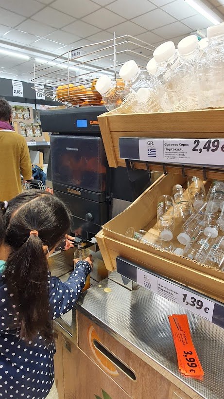 좋은 점도 많았다. 해산물 선택폭이 넓고(섬나라인데도 해물 가게 찾기 어려운 영국과 달리 마을 가운데 해물 가게가 종종 보인다), 생선 비늘을 안 치고 팔아서 나를 패닉에 빠지게 한 영국과 달리 생선 비늘이 잘 손질되어 있어서 여행지에서도 생선 한 마리를 통째 구워 먹는 호사를 누렸다. 문어 한 마리를 통째 냉동해서 10유로 조금 넘는 가격에 파는 것을 보고 바로 장바구니에 담고 싶었지만 무나 밀가루가 없으니 문어 손질할 엄두를 내기가 어려웠던 것은 좀 아쉽다. 햇살이 좋으니 과일이 신선하고, 스페인에도 있다고 하는 오렌지주스를 바로 짜 먹는 기계가 마트에 비치되어 있기도 했다. 다만 스페인에서 먹으면 오렌지 본연의 단맛이 폭발한다는데, 그리스 리들은 저렴한 오렌지를 쓰는지 맛은 그냥 그랬지만 가성비는 좋았다. 영국 돼지고기는 왜인지 냄새가 잘 안 빠지는데, 돼지고기를 막 구워도 맛있었다.