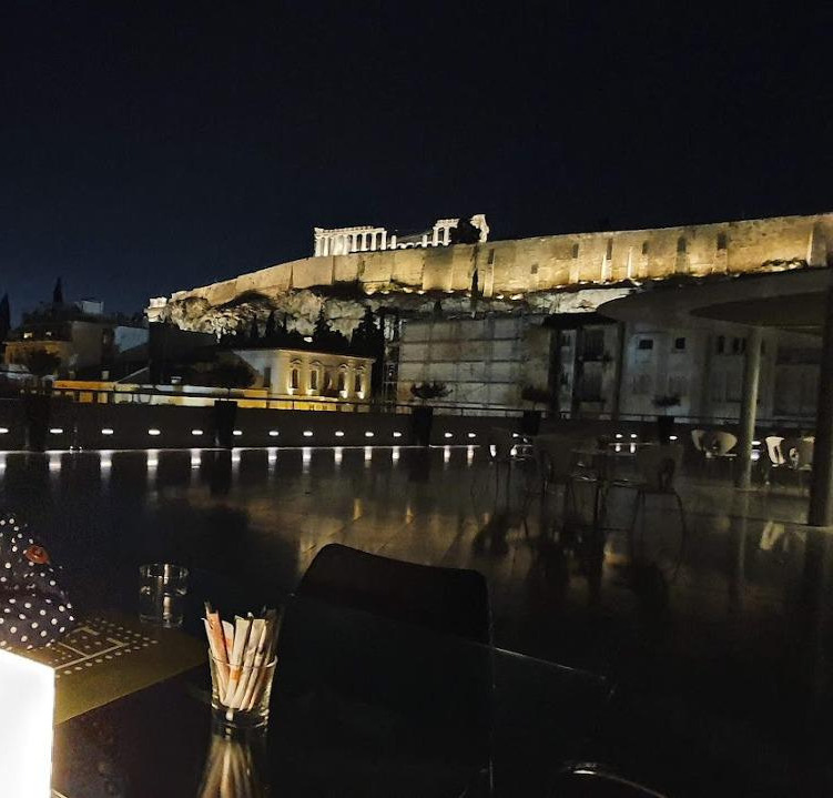 아테네 여행 중 자신 있게 추천할 수 있는 것은 아크로폴리스 박물관 레스토랑에서 야경을 보며 하는 저녁식사이다. 물론 메인 메뉴가 17유로 전후로 그리스에서 먹은 것 중 가장 비싼 가격이었다. 하지만 아크로폴리스 야경을 정통으로 바라볼 수 있는데, 한국이든 영국이든 이 가격에 이런 곳에서 저녁식사를 할 수 있을까? 자리가 없을까 걱정했지만 늦은 시간에 가서 그런지 야외 자리가 아주 한산했고 실내에서는 멋지게 차려입은 그룹이 모임을 하고 있었다. 평소에는 20시에 닫지만 금요일 토요일에 연장영업을 하는데, 사람이 적은 이유를 추측해보자면 우리가 좀 늦게(20시 넘어서) 가기도 했고 가격대도 있고, 다른 아크로폴리스 뷰 볼 수 있는 식당도 있는데 여기는 박물관이라 입장 시 방역 통제도 해서 그런 게 아닐까 싶다 (차마 "너네 사람 왜 이거밖에 없어?" 하고 묻지는 못했다). 아무튼 사람 많은 것을 싫어하는 우리는 매우 쾌적하게 아크로폴리스 야경이라는 호사를 누릴 수 있었다. 메뉴는 한정적이었지만 맛은 무난하게 괜찮았고 바스에 딸려 나온 돌마네스(우리나라 연잎밥과 비슷. 포도잎으로 쌀, 고기 등을 싸서 찐 요리)가 맛있었다. 여담이지만 여기서 먹은 돌마네스 생각에 마트 통조림도 사보았으나... 통조림 돌마네스는 절대 비추한다. 약간의 거리를 두고 아크로폴리스를 보고 있자니 고대에도 밤에 아크로폴리스에서 횃불을 밝혀 주변 도시 국가들에게 위용을 자랑했을지, 내 지식 범위를 넘어서는 의문이 생겼다. 모르긴 몰라도 아테네 시민들이 극장 공연을 즐겼으니 비슷한 뷰가 연출되었을 수도 있겠다 싶다.