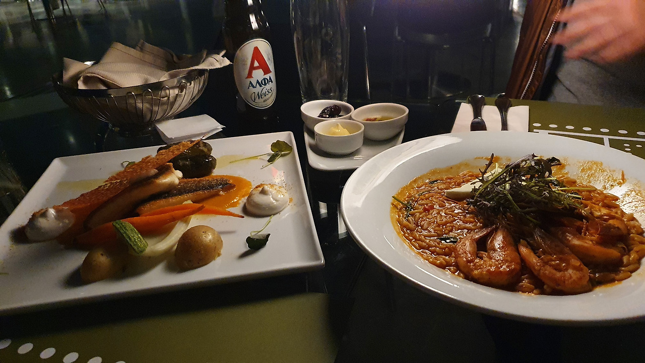 그러니 우리가 그리스에서 음식을 기대한 것은 당연한 일이었다. 다행스럽게도 그리스의 음식은 너무나 만족스러웠는데, 생각해보니 내가 4일 이상 여행하면서 김치 생각을 안 한 곳은 일본과 그리스 밖에 없었다. 일단 소싯적에는 혼자서 회 1kg를 먹어치웠던 해산물 러버인 나에게 해산물이 풍부한 그리스는 젖과 꿀이 흐르는 땅이었고, 스페인 요리가 맛있지만 짜서 한국인 입맛에 좀 안 맞을 수 있는 것과 달리 그리스 요리는 간이 맞았다. 그리스 사람들은 "이렇게 좋은 재료로 뭐하러 과한 요리를 해?"라고 한다는 말도 있던데, 유럽을 아직 4개국밖에 안 가봤지만 그리스 요리가 가장 자연스러운 느낌이었다. 아마 한국에서 바로 왔으면 이 정도로 감동적이지는 않았을 텐데, 반년 간의 영국 생활로 내 맘 속에서 그리스 음식은 제2의 소울푸드쯤이 되어버렸다.