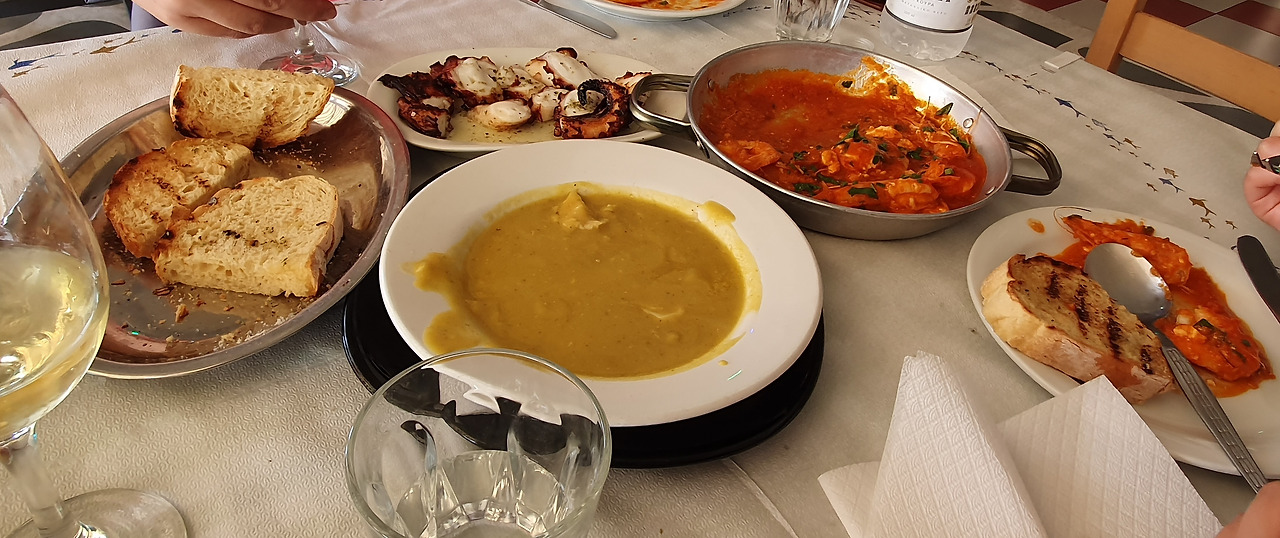 대망의 마지막 식당은 피레우스 항구에서 평점이 좋은 곳을 찾아갔다. '떠나기 전 배 터지게 해산물을 포식하자' 콘셉트로 모두가 좋아했던 문어, 야옹님이 좋아하는 새우 사가나키, 약간의 도전정신으로 생선 수프를 주문했고 결국 와인을 홀짝대다가 오징어 먹물 리조토까지 추가 주문해버렸다. 마요르카에서 나는 나름 맛있게 먹었던 오징어 먹물 빠에야가 짜다며 다소 불만이었던 남편의 평은 "그리스 게 더 맛있다". 마요르카는 빠에야를 대부분 2인분 단위로만 판다는 걸 생각하면 여기서는 1인분 주문이 가능하다는 장점도 있었다. 생선 수프는 해산물 애호가인 내 생각에도 호불호가 많이 갈릴 것 같은 맛인데, 나는 나쁘지 않았지만 그리스에 더 대중적으로 맛있는 요리는 많다.