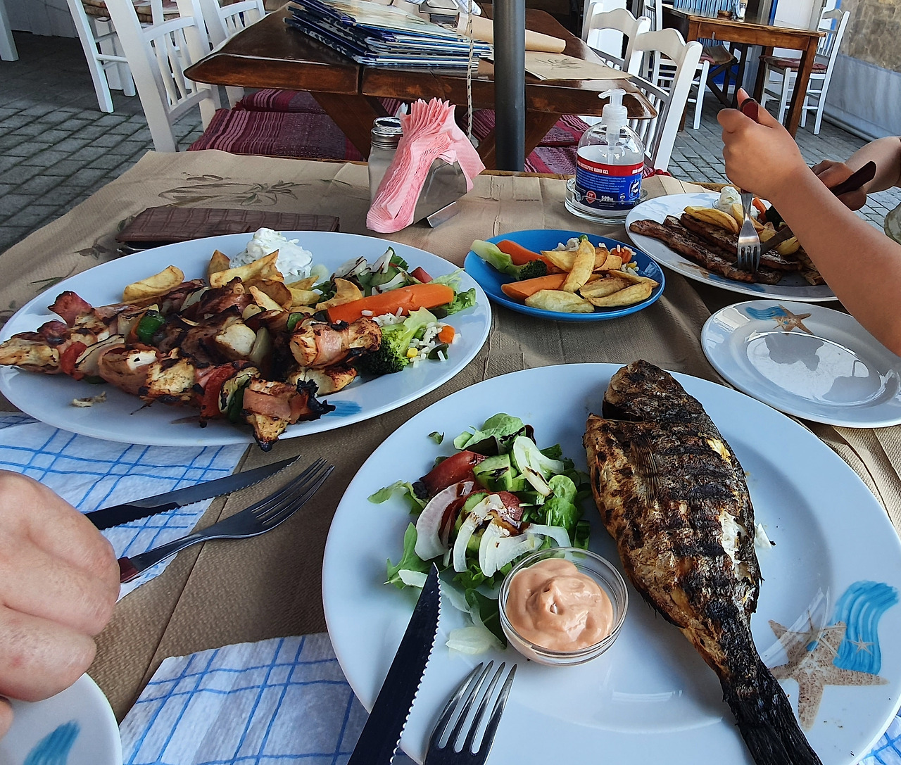 크노소스 궁전까지 주마간산으로 섭렵한 우리는 이제 크레타의 자연과 함께 숙소에서 본격적인 뒹굴거림을 만끽하려고 각오를 다졌다. 그런데 이게 웬 말, 일요일이라 마트도 대부분 영업을 안 했다. 굶주린 배를 부여잡고 부질없이 아름다운 해변가의 썰렁한 식당가를 걸어가던 우리. 다행히 문을 연 빵집에서 빵이나 사 먹자 하던 터에 마지막 희망을 안고 전방으로 파견 갔던 남편이 문 연 식당이 있다는 소식을 전했다. 어딜 봐도 좀 비싼(아테네 관광지 식당과 비슷한 가격) 관광지 식당이긴 했지만 그래도 유일하게 문 연 식당인 와중에 구글 평점도 좋았다. 그리스에서 꼭 먹어봐야 한다는 수블라키(꼬치)와 함께 생선요리와 돼지고기 구이를 주문했다. 결과는 성공. 야옹님 생일을 낀 여행이기도 했기에 이번엔 아이스크림을 꽤 자주 사줬는데, 아이스크림이 5유로나 되길래 눈물을 머금고 사줬더니 4~5 스쿱 정도가 들어가 있는 엄청난 양이었다. 그리고 여기서 드디어 말로만 듣던 그리스 식당의 서비스를 처음으로 받았다. 라키 한 병과 디저트. 식사 중에 라키 시켜서 마셨는데 아까워지는 것은 왜일까. 아무튼 아테네를 벗어난 식당에서는 대부분 식사가 끝나면 디저트 서비스를 받을 수 있었다. 아무리 맛있었지만, 그리고 이 시기에 다시 그리스를 오기는 어렵겠지만 4월 초 크레타의 일요일을 나려면 미리 장을 봐 둬야 한다는 교훈을 얻었다.