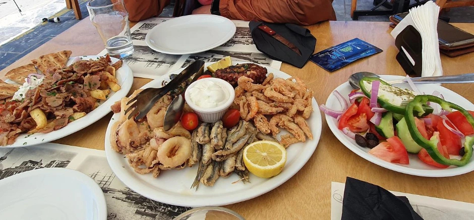 하니아 올드타운은 스탈리다의 한산한 일요일과 대조적으로 북적이고(물론 평일이었다) 식당에서 호객까지 하는, 우리로 치자면 횟집타운 같은 동네였다. 입간판의 해산물 세트를 보고 식당을 고른 우리는 이로(Gyro; 그리스의 도너 케밥으로, 꼬챙이에 고깃덩어리를 끼워 빙글빙글 돌려 구운 후 얇게 저며 먹는 요리. Gyro는 돌린다는 뜻)도 같이 주문했다. 대식가인 우리 식구도 너무 배가 불러서 다 못 먹을 양이었는데, 2/3쯤 먹은 이후엔 맛있어서 의무감에, 또는 영국에 돌아가면 못 먹는다는 생각에 꾸역꾸역 먹었는데도 결국 약간은 남겼다. 오징어는 당연히 부드럽고 문어구이는 겉은 불맛이 나는데 안은 살살 녹는 맛이었다. 나도 문어 손질을 해봤지만 도대체 어떻게 손질을 해서 구워야 이런 맛이 나는 걸까. 두 종류의 생선 튀김도 맛있었고, 느끼할 수 있는 이로도 차지키랑 먹으면 맛의 중심이 딱 잡혔다. 샐러드는 식전에 나온 것인데, 서비스인지 해물 세트에 딸려 나오는 건지는 모르겠다. 여기도 크레타 답게 라키와 디저트가 서비스로 나왔다. 해물 세트가 28유로였는데, 그리스에서 한 번은 먹어볼 만한 메뉴이다.
