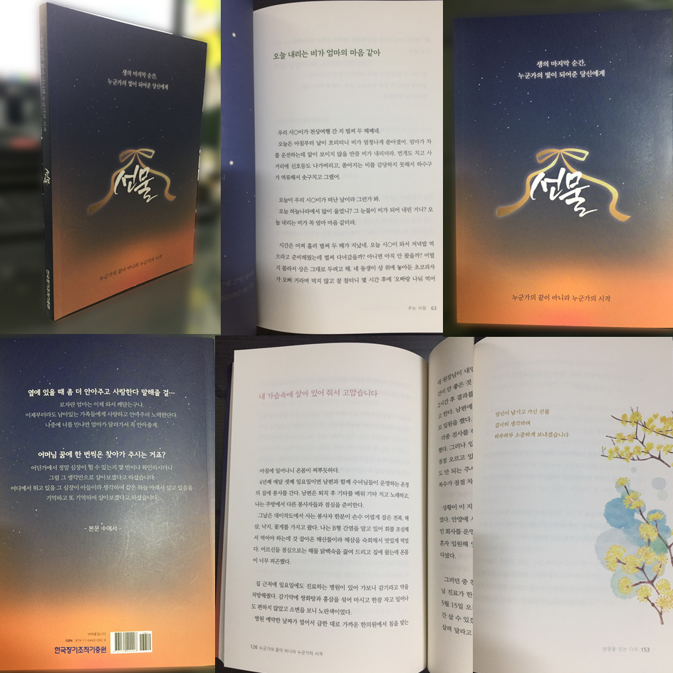 그럼에도 불구하고 <선물>은 매일 아침 눈을 뜨고 어제와 다를 것 없는 오늘의 하루가 얼마나 소중한지 다시 생각해 보게 하는 책이다. 한국장기조직기증원에서는 사례집 <선물> 도서 신청을 받고 있다. 알라딘과 교보문고에서 e북으로 볼 수도 있지만 도서를 신청해서 읽어보시기 바란다.