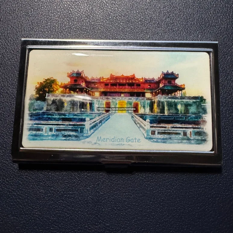 또 하나, 가벼운 알루미늄으로 제작된 명함 지갑에는 베트남 후에 왕성에 위치한 주요 랜드마크인 '자오선 문'을 수채화 스타일로 그려져 있었다. 이 작품은 고대 성채의 일부로 베트남에서는 역사적, 건축학적으로 중요한 위치에 있다.