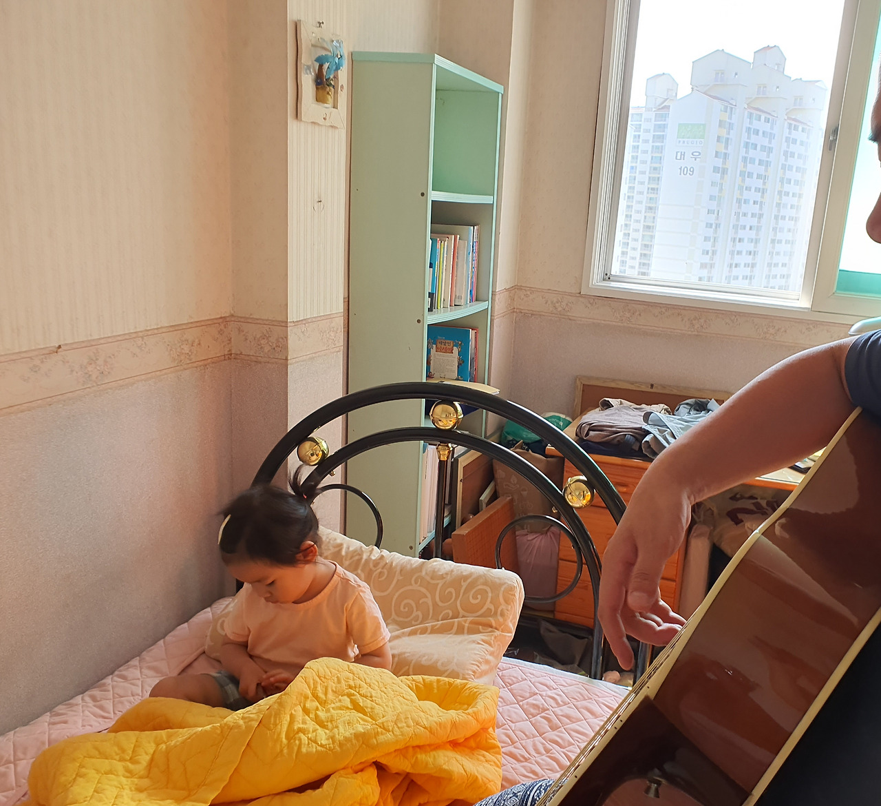 2000년의 내가 잠을 자던 그 낡은 침대 위에 2020년생인 내 딸이 앉았다. 사진을 찍고 보니 정말 타임머신을 탄 기분이다. 내 딸은 제가 앉은 그 침대 위에 얼마나 많은 세월의 먼지가 내려앉았을지 짐작도 하지 못하겠지, 중학교 시절 내 필기노트에 삐뚤빼뚤 장난기 어린 낙서가 씌어지고, 주인 잃어 조용하기만 했던 방 안에서 까르르 새 웃음소리가 볕 든 날이었다.