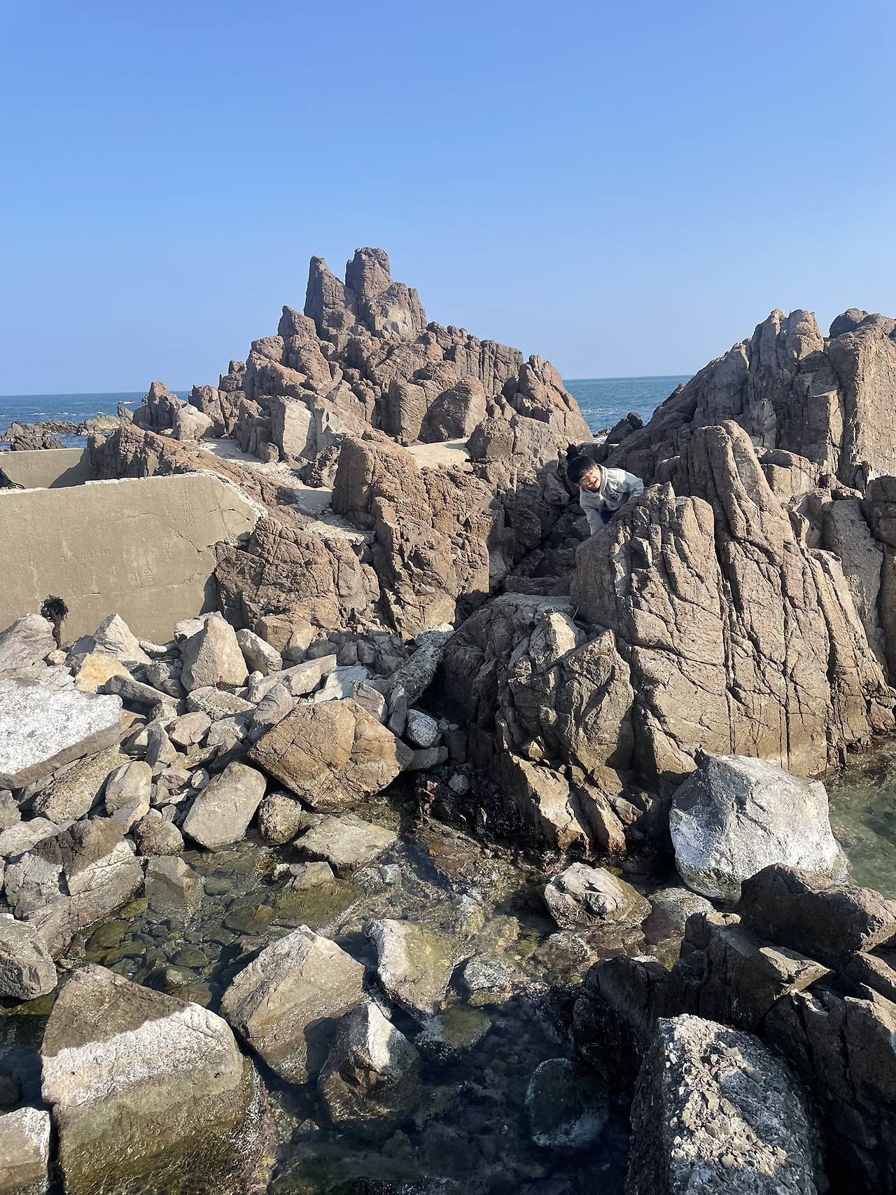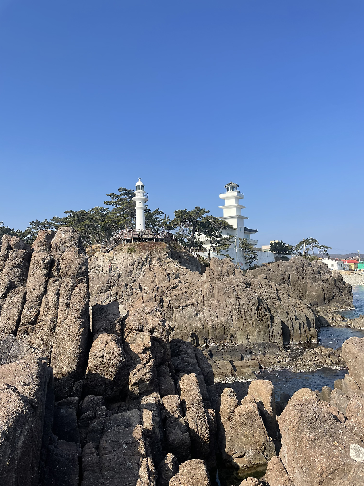 보통 송대말 등대를 검색하면 감은사지 3층 석탑 닮은 건물이 나오게 사진을 찍거나 빛 체험 전시관 소개를 보게 된다. 하지만 우리 아이들은 건물을 패스하고 주상절리로 내달린다. 등대에서 바다까지는 아슬아슬한 시멘트 계단을 조심히 딛고 내려가야 한다. 그간 본 주상절리는 절벽 아래로 기둥처럼 높다랗게 서 있어 멀리서 보며 눈으로만 즐겼다. 여긴 주상절리가 바닥에 낮게 깔린 터라 마치 정글짐을 오르내리듯 높고 낮은 돌기둥을 아이들이 넘나 든다. 부모 보기엔 불안한데 아이들은 암벽 등반 하듯 신났다. 파도가 남기고 간 불가사리, 해초 줄기가 말라 걸려 있어 보물찾기 하듯 두리번댄다. 잠깐 바다로 눈 돌렸다가 이내 저만치 가버린 아이를 눈으로 좇는다. 가파른 곳에 스스로 올랐다는 성취감에 잔뜩 들떠 있는 얼굴에 ”이제 가자 “라는 말을 삼키고 "조심히! 천천히!" 정도 외쳐준다. 어느새 주상절리 끝 바다와 만나는 높은 위치에 오른 남편이 소년 같아 사진을 남겨본다. 바다 쪽에서 보니 검은 절벽 위에 얹어진 송대말 등대가 새하얗다. 아이들 이마에 땀이 맺혔다. 양손에는 전리품이 가득하다. 이제쯤 가야 하지 않을까 싶었을 때 첫째의 화장실행으로 간신히? 주상절리에서 빠져나올 수 있었다. 주상절리 키즈카페가(이제 우린 이렇게 부르기로 했다) 어찌나 좋았던지 빛 체험 전시관을 둘러보고 점심시간대가 훌쩍 지나 허기가 찾아왔음에도 다시 내려가자고 야단이었다. 가만 보면 여행에서는 의외의 장소가 우리만의 핫플이 된다.