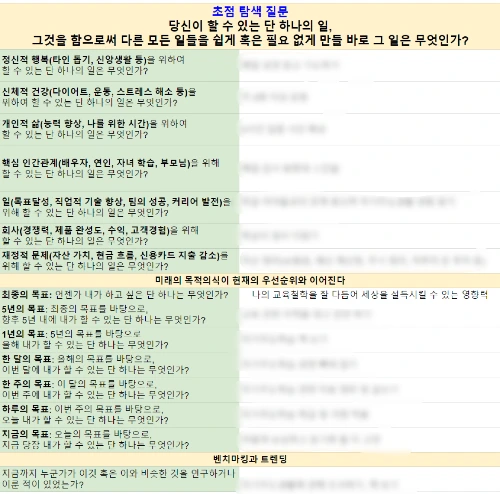 그렇다. 원씽이 추상적으로 느껴지는 이유는 피라미드의 꼭대기에 있는 그 중요한 단 한 가지를 찾기 어렵기 때문이다. 책에서는 가장 중요한 것이 무엇인지 선택하고 다른 문제는 손을 쓸 수 없을 만큼 악화되지 않도록 가끔씩 중심을 잡아주면 된다고 한다. 개인적 삶에서는 버리고 가는 것이 없게 하고, 반대로 직업적 삶에서는 그렇게 해야 한다고 한다. 가장 중요한 업무에는 극단적일 정도로 시간을 투자하고 나머지 부분에 대해서는 큰 부담을 갖지 마라고 한다. 그런데 실제 삶에서는 가장 중요한 것 하나를 고르지 못하기에 뭘 내려놓아야 할 지도 망설여지는 것이다. 가장 중요한 것 하나를 두고 그렇다면 5년 이내에는 무얼 해야 하는지, 1년 안에는 무엇을 해야 할지, 한 달, 일주일, 하루 그리고 지금 무엇을 해야 하는지 고민해야 하는데 그 출발점인 '가장 중요한 것'을 깨닫는 게 어려운 것이다. 옛날 '이상형 월드컵'처럼 하고 있는 일들을 마주 보게 촤고 세워두고, 고르고 골라서 1위를 꼽아야 하는데, 그게 안되니 여러 마리 토끼를 잡는 꼴이 될 수밖에.