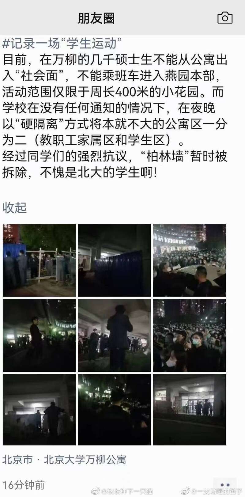 ↑ 15일 밤 완류 기숙사 시위 모습을 담은 사진들. 누군가 위챗 펑요췬(微信朋友圈, 한국으로 치면 카카오톡 페이지나 페이스북 같은 기능)에 올린 것이다. 완류 기숙사를 두 군데로 쪼개버리려 했던 벽을 ‘베를린 장벽’으로 묘사하고 이를 무너뜨린 학생들을 ‘역시 북경대 학생들이다’라고 말하고 있다. (사진 출처=온라인)