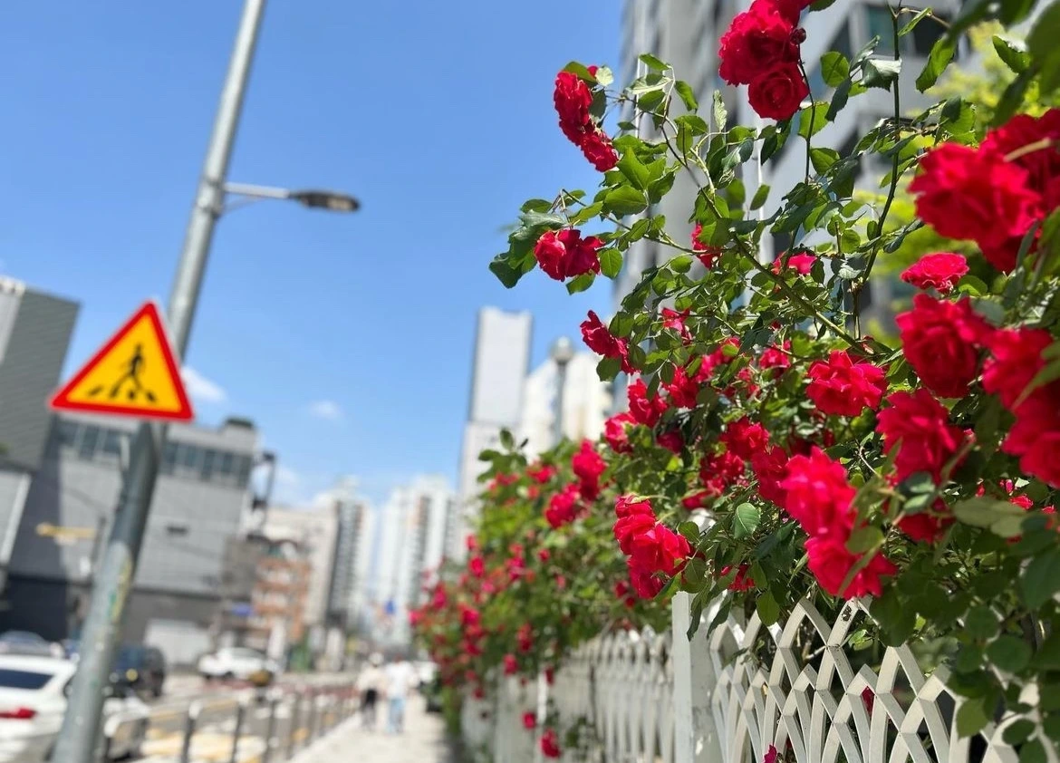 엄마와 함께 점심을 먹고 산책을 했던 어느 늦은 오후. 이름도 모르는 아파트 화단에 핀 장미가 새빨간 미소를 지으며 햇살 아래서 조용히 빛나고 있었다.