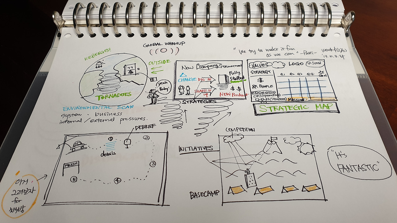 그렇게 혼자 자습하는 시간은 순조롭게 진행이 되었다. 대략 3주 정도 다양한 상황을 그림으로 재빠르게 표현해내는 방법을 강의를 통해서 익히고, 손으로는 제시된 그림 양식을 똑같이 따라 그려보았다. 조용한 장소에서 그림 그리기에 집중하는 것은 꽤나 행복한 일이었다. 하얀 종이에 다양한 색깔의 펜으로 그림을 그리다 보면, 세상에서 일어나는 모든 일을 내 손으로 그려낼 수 있겠다는 자신감이 솟아오르기도 했다.