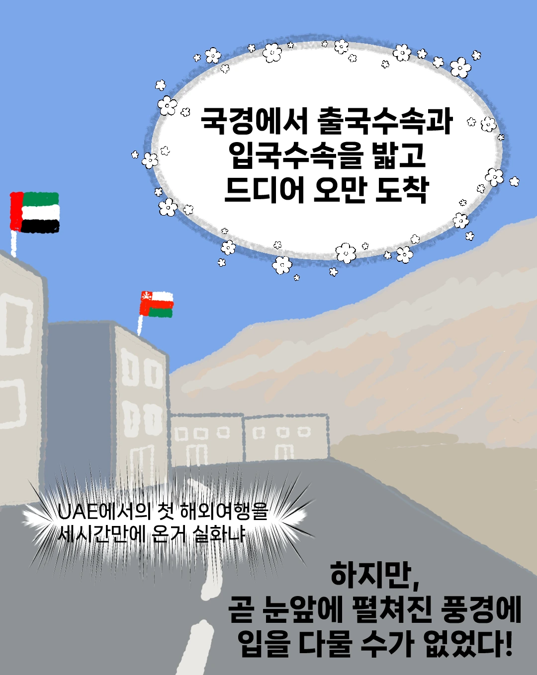 그렇게 세 시간 만에 도착한 오만의 무산담주는 생각했던 것보다 아름답고 생경한 모습이 가득했습니다. 국경을 넘자마자 끝없이 펼쳐지는 바다를 끼고 해안가 도로를 마음껏 달리자 그동안 쌓인 스트레스가 뻥-하고 뚫리는 듯한 느낌마저 받을 수 있었습니다. 또한 오만사람들은 중동에서도 친절하기로 유명합니다. 오만이라는 국가가 중동에서 분쟁의 이슈가 있을 때마다 중재를 하는 역할을 해왔기도 했고 수니파도 시아파도 아닌 이바디라는 오만의 종파가 극단주의하고는 거리가 먼 온화한 성격을 띠고 있어서 그런지도 모르겠습니다. 듣던 대로 오만 국경에서부터 만난 사람들은 친절했고 미소와 농담이 넘쳐서 여행의 시작부터 즐거움이 가득했습니다.