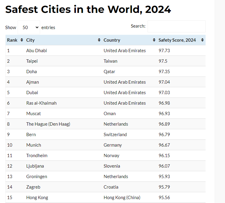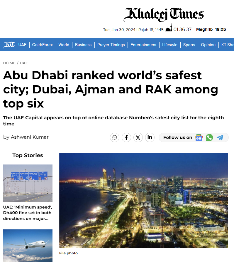 아부다비가 2024년 세계에서 가장 안전한 도시로 뽑혔다.