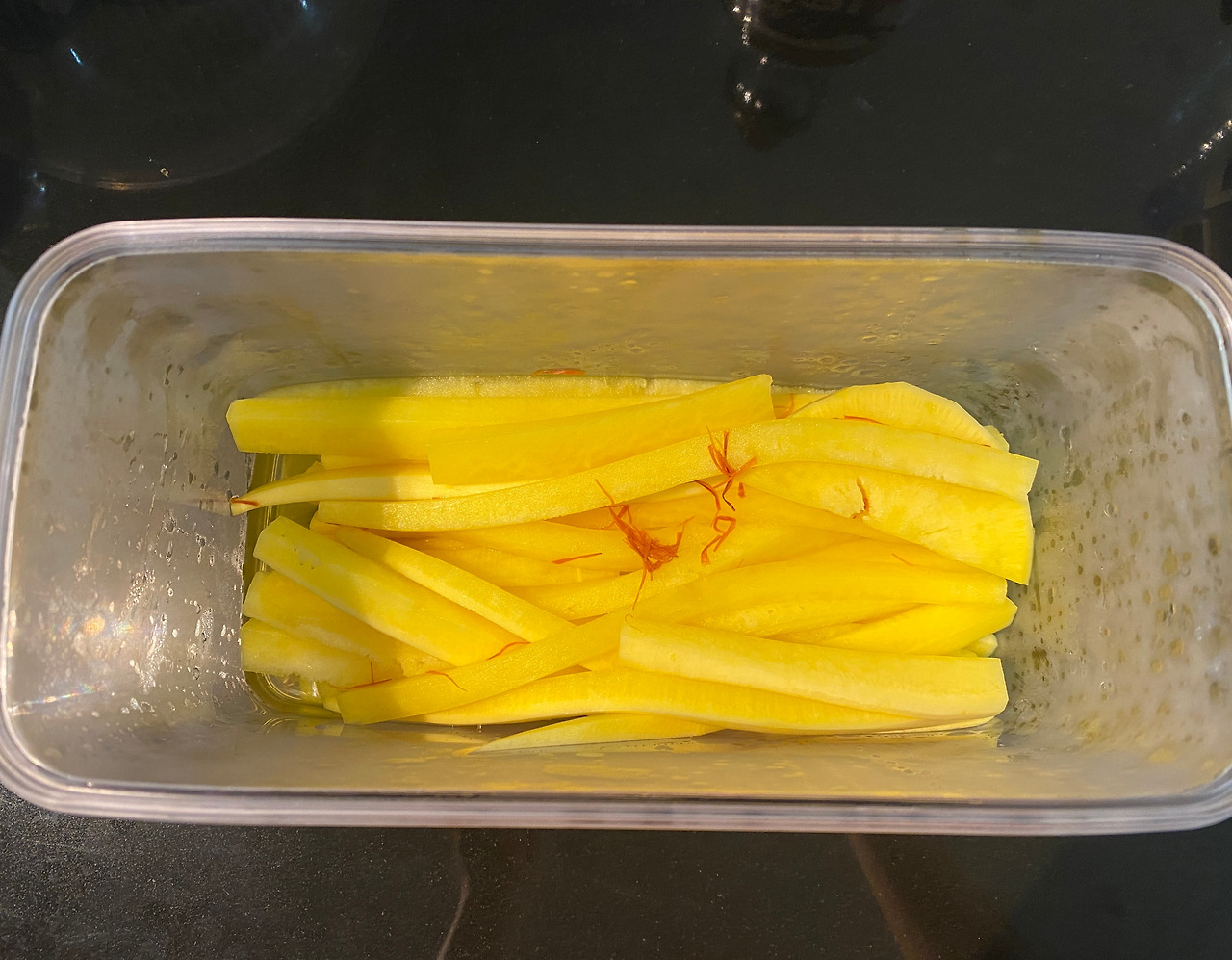 노랑 단무지를 만들려면 치자가 필요하지만 여기서는 구하기 어려워 대신 사프란을 털어 넣었다. 다행히 색이 예쁘게 잘 우러나왔다. 숙성시킨 뒤 먹어보니 맛도 일품이었다. 신이 나서 아이의 도시락에 단무지를 가지런히 넣어주었다. 노란색 덕분인지 오늘따라 도시락이 한층 빛이 나는 기분이었다.
