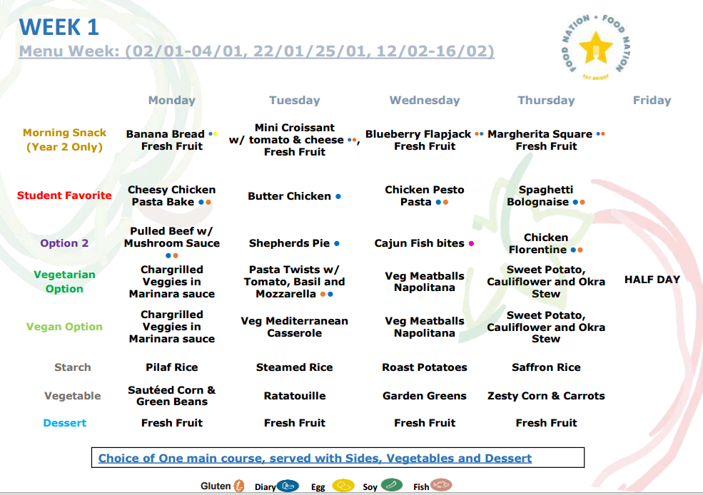 식단표를 보고 있으니 급식 업체가 얼마나 머리를 싸매고 식단 고민을 하는지 느껴졌다. 알레르기가 있는 아이들을 위해서 글루텐, 유제품, 계란, 콩, 생선을 따로 표기했다. 한국에서는 계란이나 유제품 알레르기가 있는 아이들은 종종 보았는데 여기서는 견과류 알레르기를 비롯하여 상상을 초월하는 알레르기를 가진 사람들도 만나 보았다. (그중 하나가 오렌지 알레르기였다.)