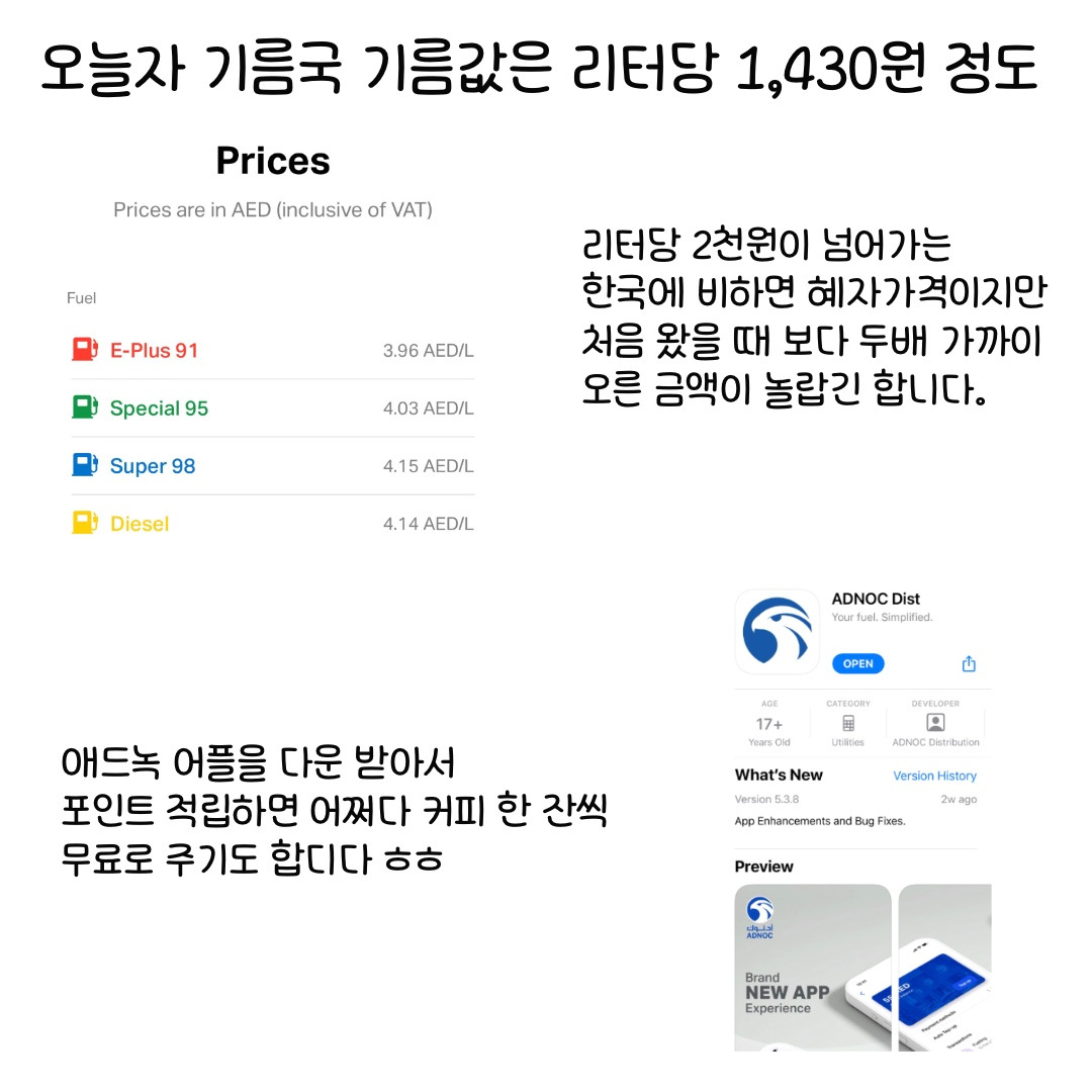 대중교통 이용이 불편한 아부다비 특성상 아이들을 매일 등하교시켜야 하는 엄마들은 자차 이용이 필수인데 유가가 이렇게 무섭게 오르니 한국에 살 때보다 기름값 지출이 더 많이 드는 것 같습니다.