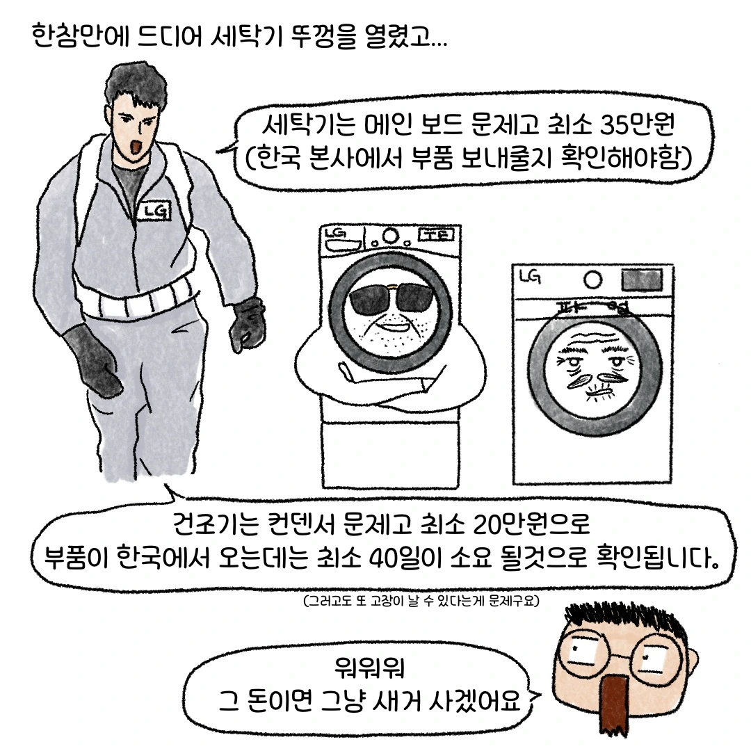 그리고 건조기를 보더니 이건 콘덴서 문제라고 최소한 500딜함 (20만원)이 발생할 것이고 한국에서 부품이 오는 데는 최소한 40일이 걸릴 거라고 안내했다.