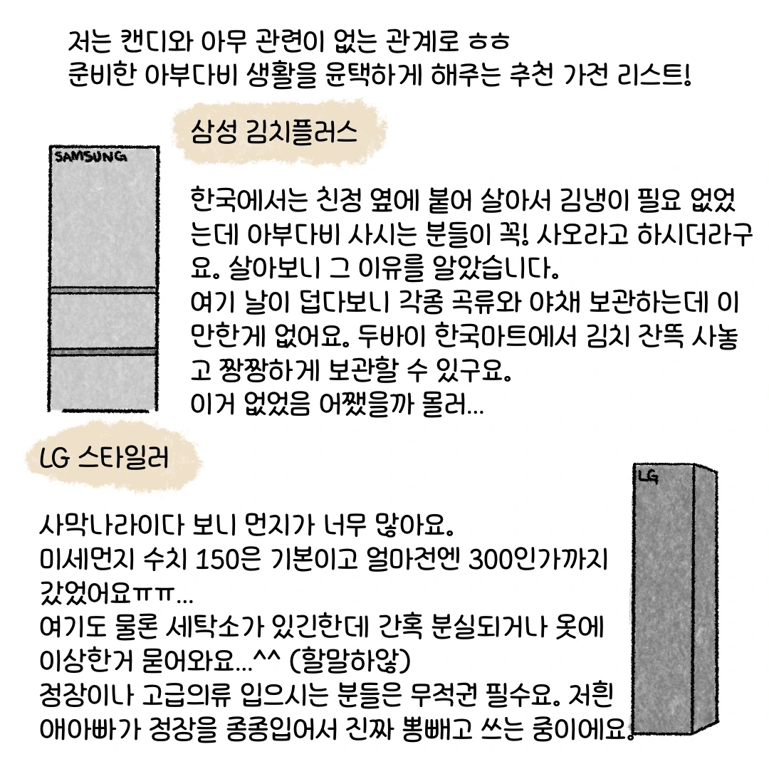 UAE에 와서 삼성이나 LG 가전들이 자주 보여서 한국인으로서 기뻤는데 기간이 짧은 주재원의 라이프사이클 상 고오오오오급진 가전을 사기에는 가격적인 부담이 너무 커서 다른 브랜드를 산 것이 마음이 아프다.