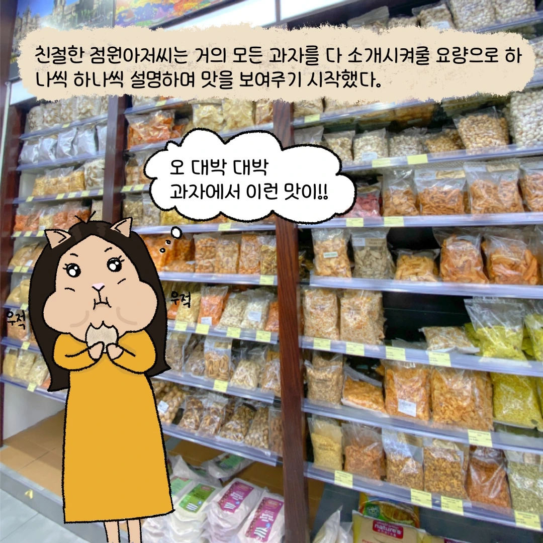 직접 튀겨먹는 과자를 제외하고는 매장에서 전부 시식이 가능하니 입맛에 맞는 과자를 고르기가 편했습니다. 저의 경우는 찐할배 입맛이라 슴슴한 짠맛을 좋아해서 마트에서 파는 외국 봉지과자들이 자극적이라고 느껴지곤 했는데, 이렇게 직접 튀겨먹는 과자의 경우 입맛에 맞게 소금 양을 조절할 수가 있으니 이리도 찰떡일 수가 없습니다.