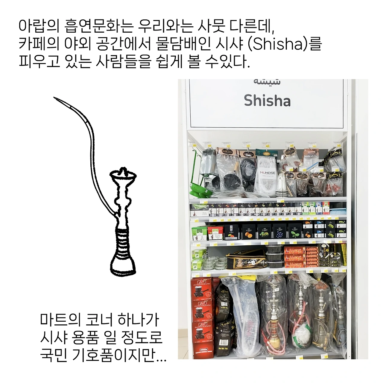 위에서 말씀드렸듯이 동네마다 '시샤'맛집들이 있는데, 그곳에 가면 많은 사람들이 한 시간이고 두 시간이고 시샤를 피우면서 시간을 보내는 모습을 볼 수 있습니다. 때론 어린아이들이 그런 부모들 바로 옆에서 같이 그 향을 맡으면서 시간을 보내기도 하지요.