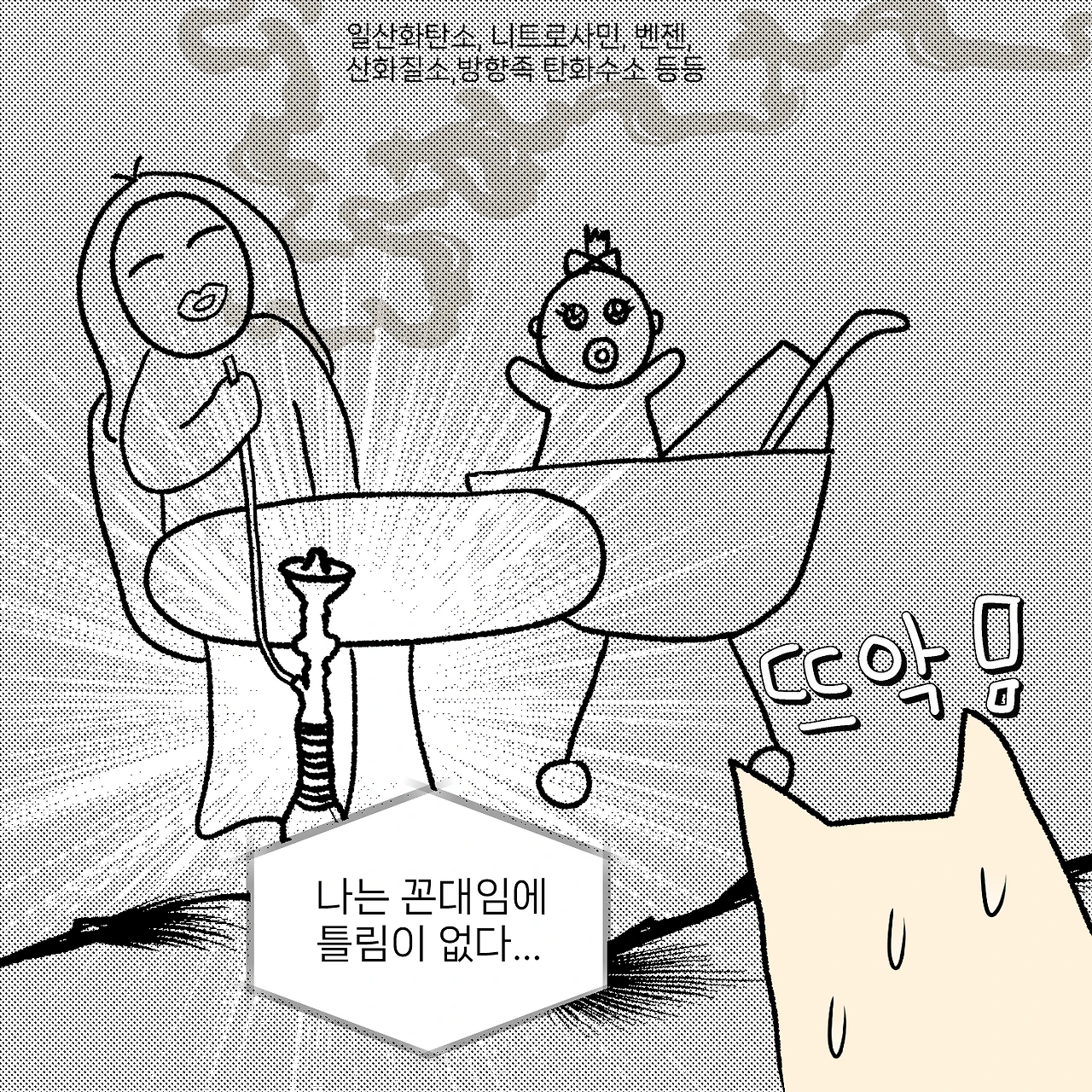 시샤는 담배와는 달리 건강에 해롭지 않다고는 하지만, 여러 보고서에 의하면 담배보다 장시간 피우기 때문에 몇 배의 해로움이 있으며, 일산화탄소 등 몸에 해로운 화학물질이 가득하다고 하니 아이들 앞에서만큼은 피하고 싶은 게 "유교걸" 출신 “꼰대” 엄마의 마음입니다.