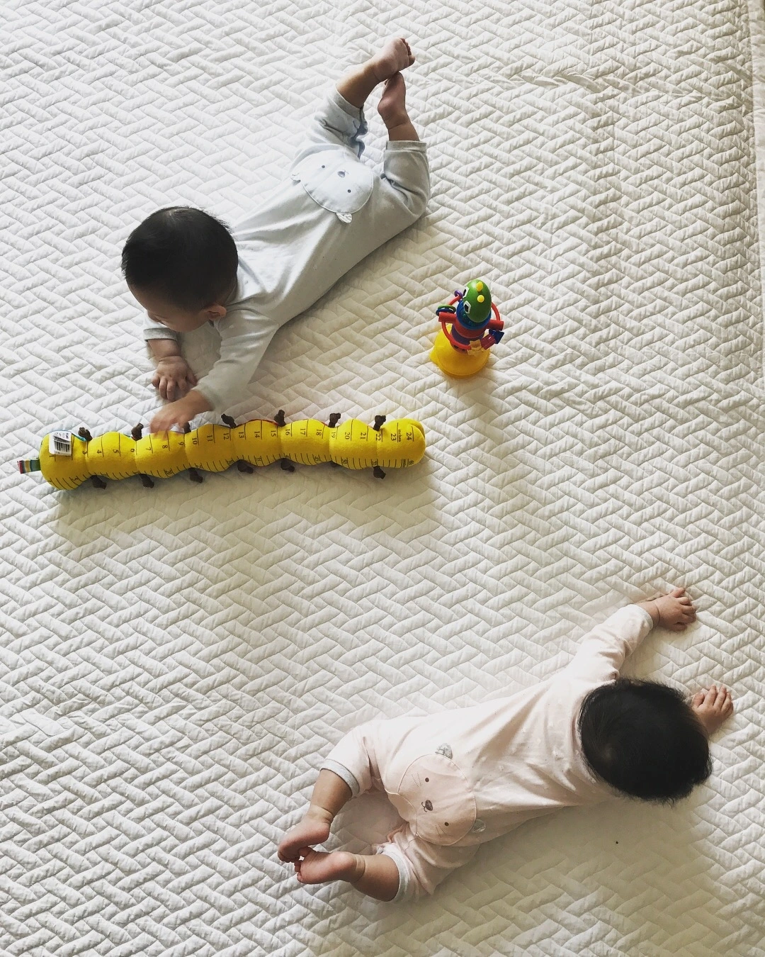 나의 대답은 항상 같다. 쌍둥이 속설을 확인하려는 이들에겐 '아쉽게도 아직 텔레파시를 주고받는 현장을 목격하지 못했다'거나, '둘이 서로 바이러스를 옮기니까 같이 아프겠지' 식의 기대에 못 미치는 답을 돌려줄 뿐. 나는 오히려 두 아이가 외모, 성향, 자는 것, 먹는 것, 우는 것... 다 너무 달라서 '어쩌면 이렇게까지 다를까?' 궁금한 적이 더 많았다.
