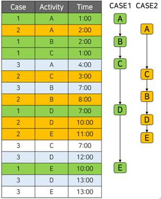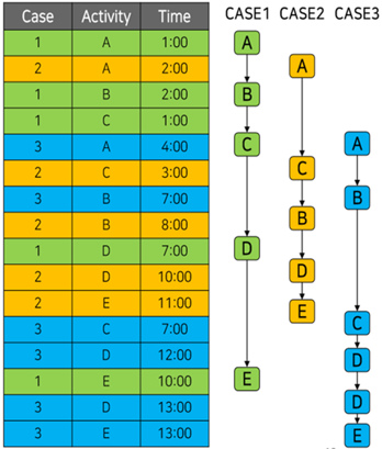 아래 그림에서 Case라고 하는 것은 수행된 하나의 업무라고 보면 되고, Activity라는 것은 업무상에서 처리된 단위 업무라고 보면 된다. (단위 업무들이 모여 하나의 업무 프로세스를 형성) 그리고 Time 이란 단위 업무가 수행된 시간이다.