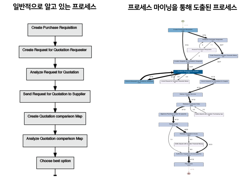 상기의 그림을 통해 일반적으로 알고 있는 프로세스와 프로세스 마이닝을 통해 도출된 프로세스에 대한 차이점을 명확히 볼 수 있다. 프로세스 마이닝을 통해 도출된 프로세스 맵은 로그 데이터 분석 시 Time이 주요 분석 데이터로 포함되기 때문에 어느 프로세스에서 병목이 발생하고 있는지 여부를 파악할 수 있으며, 비정상적인 경로로 진행되는 업무에 대한 파악을 통해 컴플라이언스 관점의 문제에 대응이 가능하다. 업무의 복잡성과 더불어 시스템의 복잡성이 높아지고 있는 현재의 환경 속에서 IT시스템의 거버넌스와 ITSM관점의 효율적인 대응, 나아가 프로세스의 지속적인 혁신을 위해서는 프로세스 표준은 고정적인 관점이 아니라 유연성 관점에서 관리해야 한다. 이를 위해서 프로세스에 대한 과학적 분석 방법에 대한 적용을 적극적으로 고려해 나가야 할 시점이다.