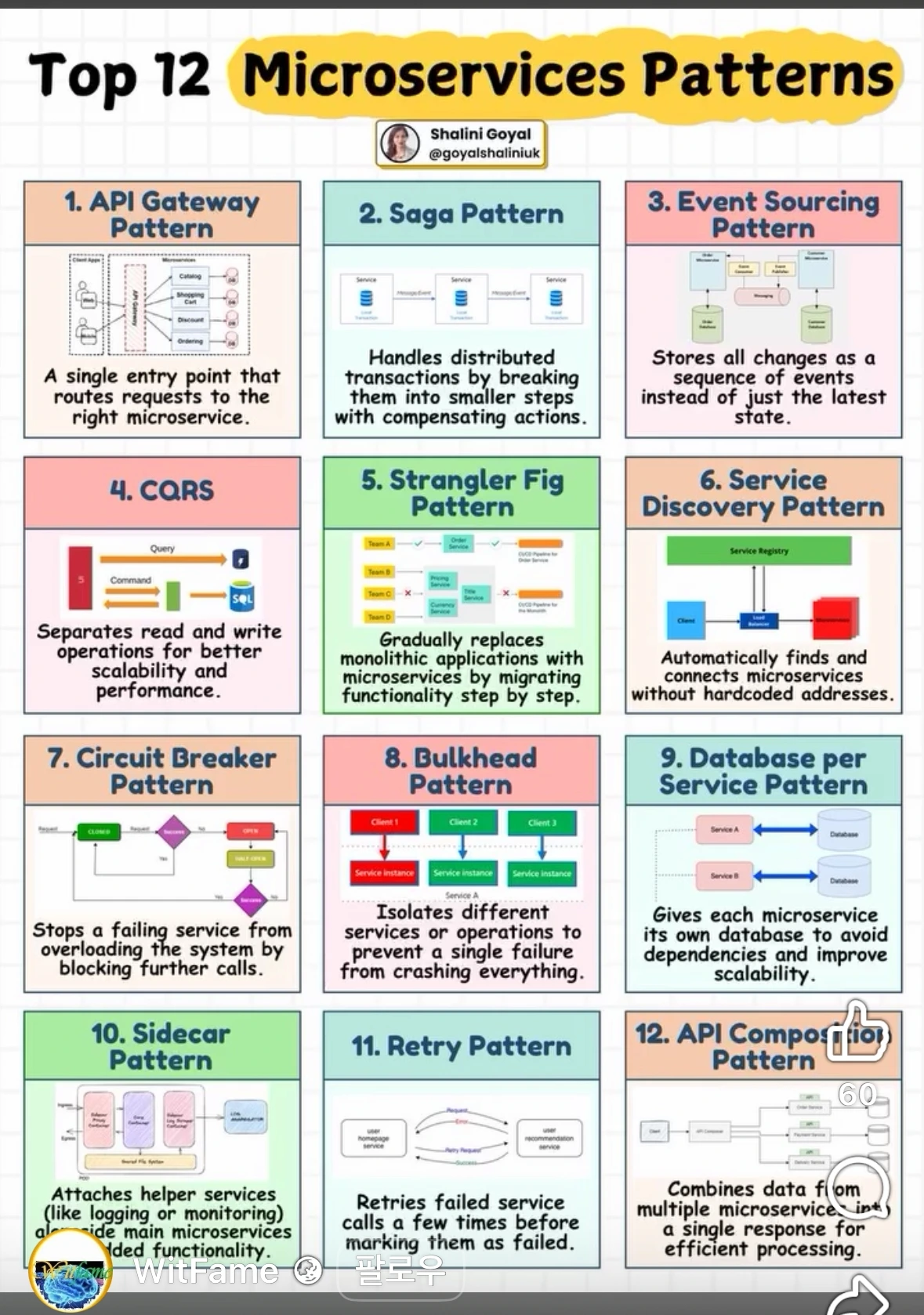 이런 고민에 대해 한눈에 핵심 개념을 짚어주는 유익한 인포그래픽을 최근 발견하게 되어, 이 글을 통해 소개드리고자 합니다. 디자이너이자 기술 커뮤니케이터인 Shalini Goyal(@goyalshaliniuk) 님이 제작한 “Top 12 Microservices Patterns” 인포그래픽은 마이크로서비스 아키텍처를 구성할 때 반드시 이해하고 있어야 할 12가지 대표적인 설계 패턴을 시각적으로 간결하게 정리하고 있습니다.