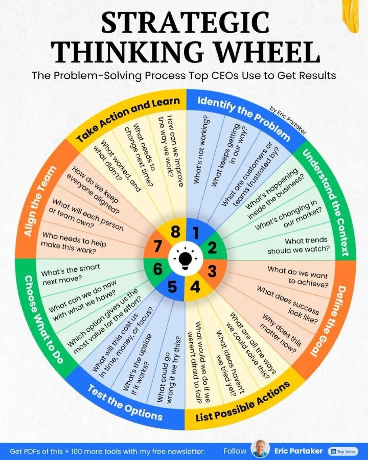이 전략적 사고 휠은 경영 컨설턴트이자 퍼포먼스 전문가인 Eric Partaker가 제작하였으며, 다양한 고성과 CEO들의 문제 해결 방식을 시각적으로 정리한 것입니다.