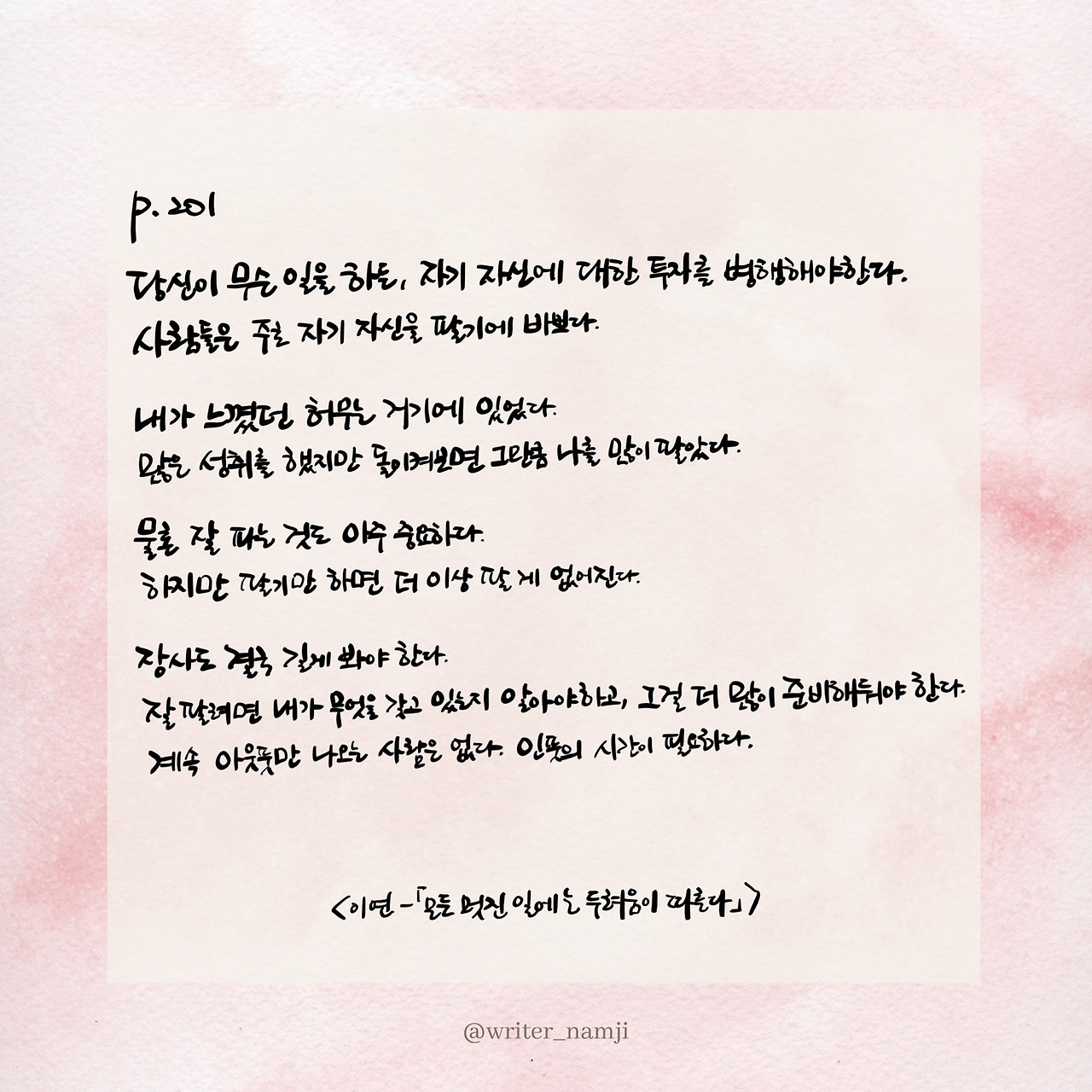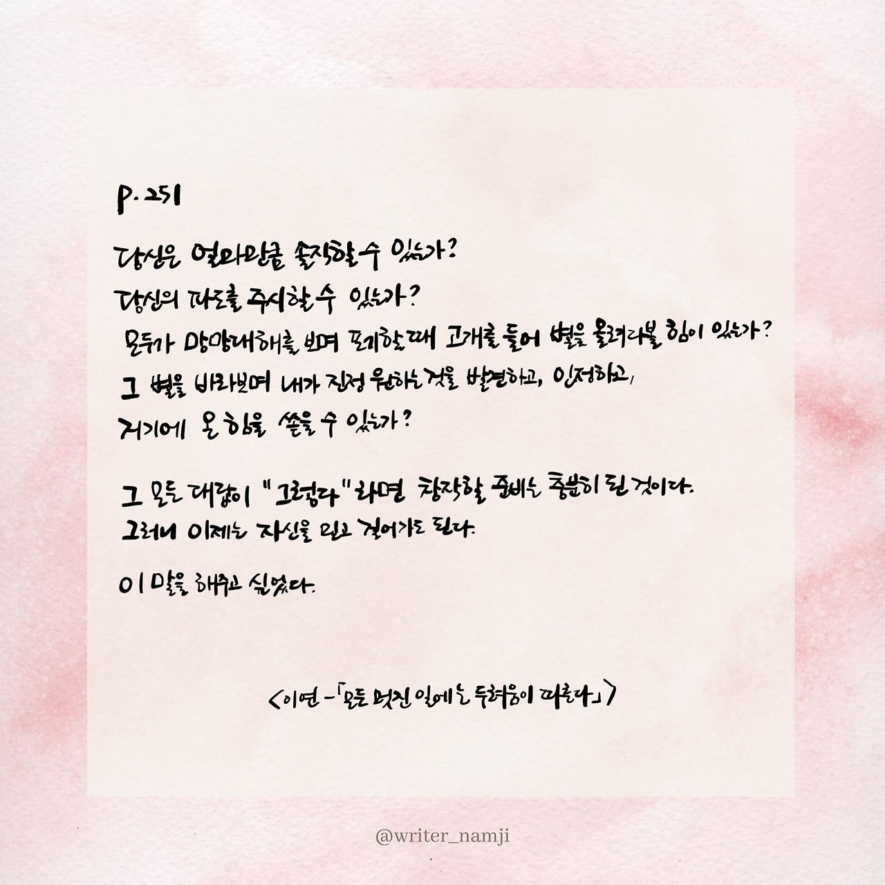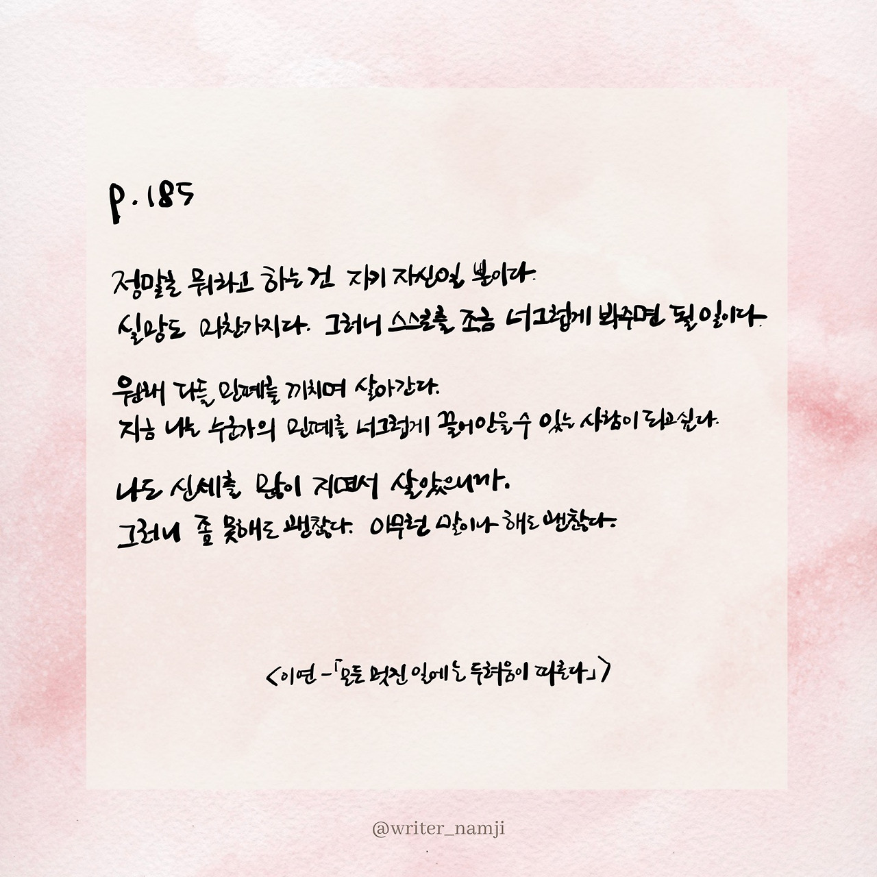 정말로 뭐라고 하는 건 자기 자신일 뿐이다. 실망도 마찬가지다. 그러니 스스로를 조금 너그럽게 봐주면 될 일이다. 원래 다들 민폐를 끼치며 살아간다. 지금 나는 누군가의 민폐를 너그럽게 끌어안을 수 있는 사람이 되고 싶다. 나도 신세를 많이 지면서 살았으니까. 그러니 좀 못해도 괜찮다. 아무런 말이나 해도 괜찮다.