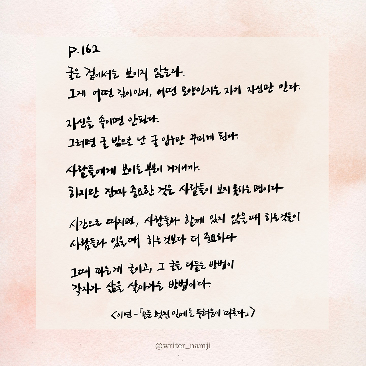 다들 그 굴이 만나지 않는다고 생각하기 때문에 땅 파기를 망설인다. 이것저것 파면 전문성이 떨어지지 않을까? 땅속에 보물이 없으면 어떡하지 전부 들쑤시다 나이만 들면 어떡해?등등. 그런데 내가 여러 땅을 파보니, 파본 게 후회되는 굴은 없었다. 개미굴처럼 언젠가는 모든 땅이 만난다. 땅굴 모양이 당신이 살아온 삶의 모양이다. 깊어지고. 그다음 넓어진다는 건 이런 의미라는 걸 말해주고 싶었다.