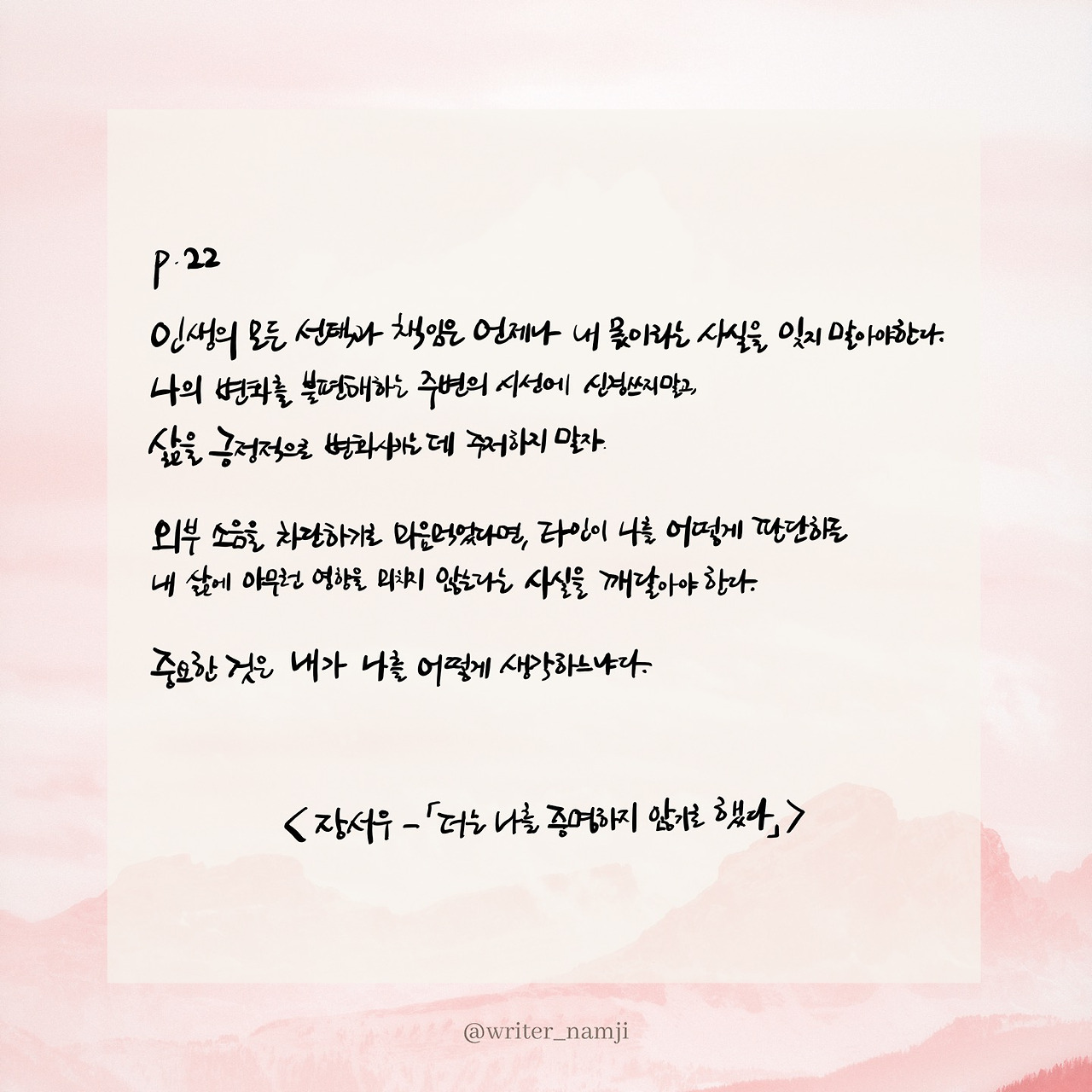 인생의 모든 선택과 책임은 언제나 내 몫이라는 사실을 잊지 말아야 한다. 나의 변화를 불편해하는 주변의 시선에 신경 쓰지 말고, 삶을 긍정적으로 변화시키는 데 주저하지 말자. 외부 소음을 차단하기로 마음먹었다면, 타인이 나를 어떻게 판단하든 내 삶에 아무런 영향을 미치지 않는다는 사실을 깨달아야 한다. 중요한 것은 내가 나를 어떻게 생각하느냐다.
