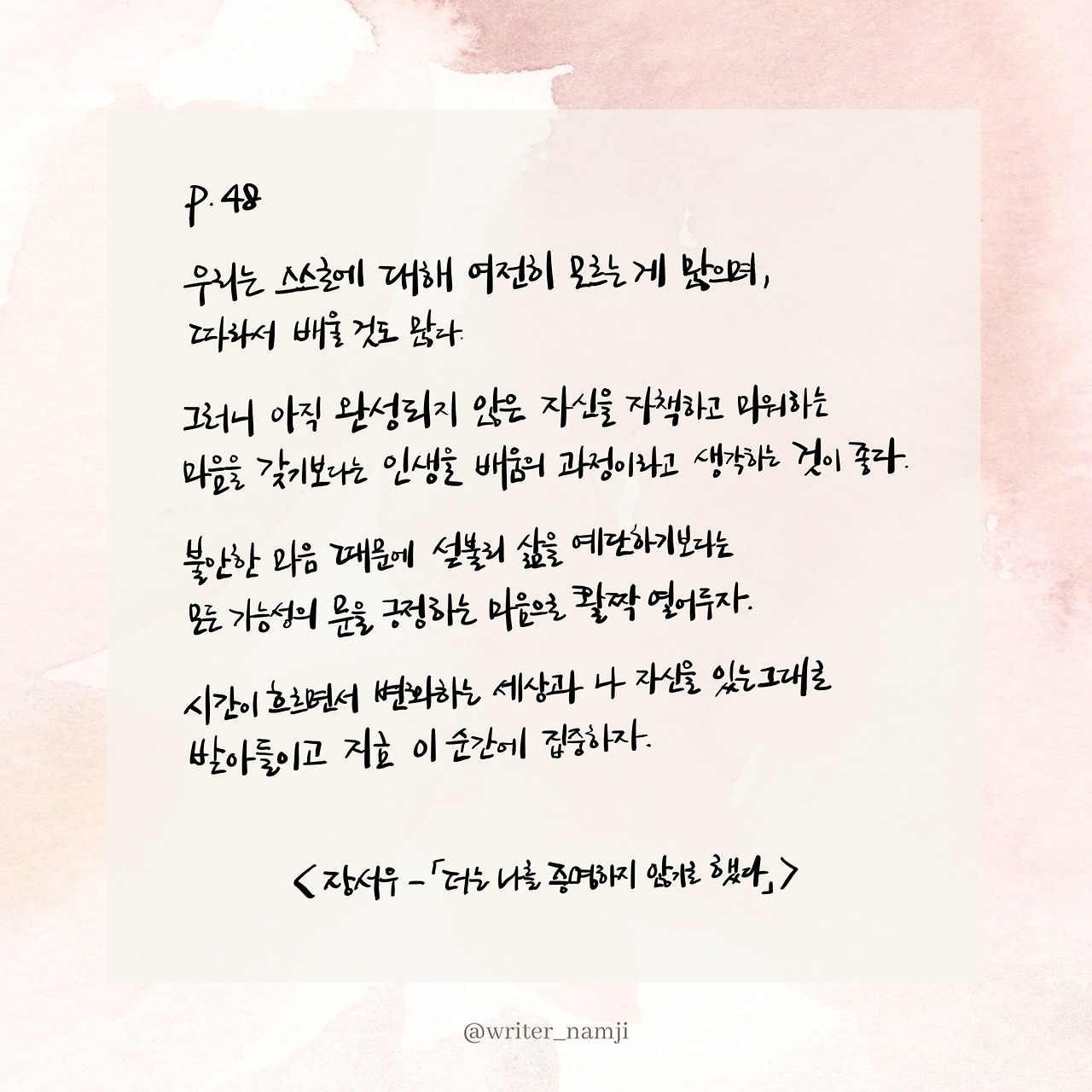 우리는 스스로에 대해 여전히 모르는 게 많으며, 따라서 배울 것도 많다. 그러니 아직 완성되지 않은 자신을 자책하고 미워하는 마음을 갖기보다는 인생을 배움의 과정이라고 생각하는 것이 좋다. 불안한 마음 때문에 섣불리 삶을 예단하기보다는 모든 가능성의 문을 긍정하는 마음으로 활짝 열어두자. 시간이 흐르면서 변화하는 세상과 나 자신을 있는그대로 받아들이고 지금 이 순간에 집중하자.