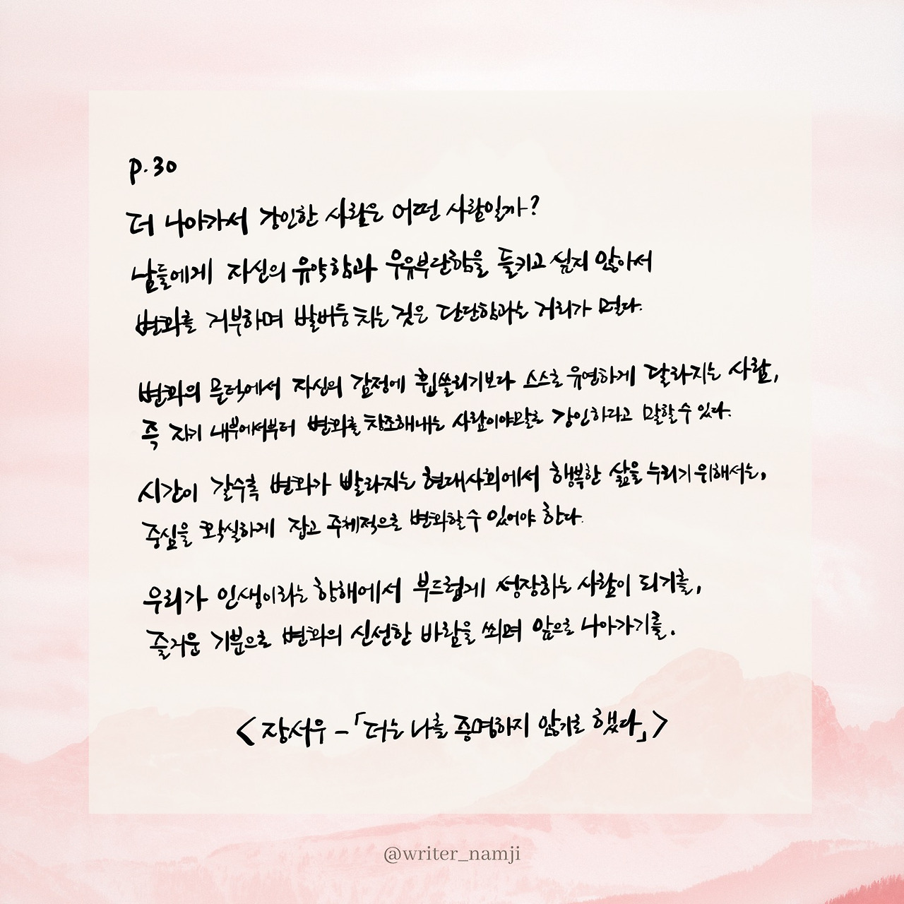 더 나아가서 강인한 사람은 어떤 사람일까? 남들에게 자신의 유약함과 우유부단함을 들키고 싶지 않아서 변화를 거부하며 발버둥 치는 것은 단단함과는 거리가 멀다. 변화의 문턱에서 자신의 감정에 휩쓸리기보다 스스로 유연하게 달라지는 사람, 즉 자기 내부에서부터 변화를 창조해내는 사람이야말로 강인하다고 말할 수 있다. 시간이 갈수록 변화가 빨라지는 현대사회에서 행복한 삶을 누리기 위해서는, 중심을 확실하게 잡고 주체적으로 변화할 수 있어야 한다. 우리가 인생이라는 항해에서 부드럽게 성장하는 사람이 되기를, 즐거운 기분으로 변화의 신선한 바람을 쐬며 앞으로 나아가기를.