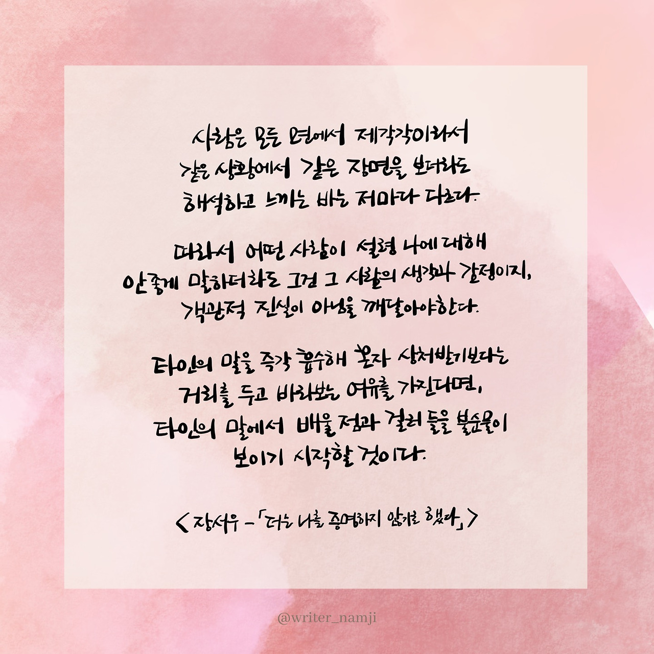 사람은 모든 면에서 제각각이라서 같은 상황에서 같은 장면을 보더라도 해석하고 느끼는 바는 저마다 다르다. 따라서 어떤 사람이 설령 나에 대해 안 좋게 말하더라도 그건 그 사람의 생각과 감정이지, 객관적 지실이 아님을 깨달아야한다. 타인의 말을 즉각 흡수해 혼자 상처받기보다는 거리를 두고 바라보는 여유를 가진다면, 타인의 말에서 배울 점과 걸러 들을 불순물이 보이기 시작할 것이다.