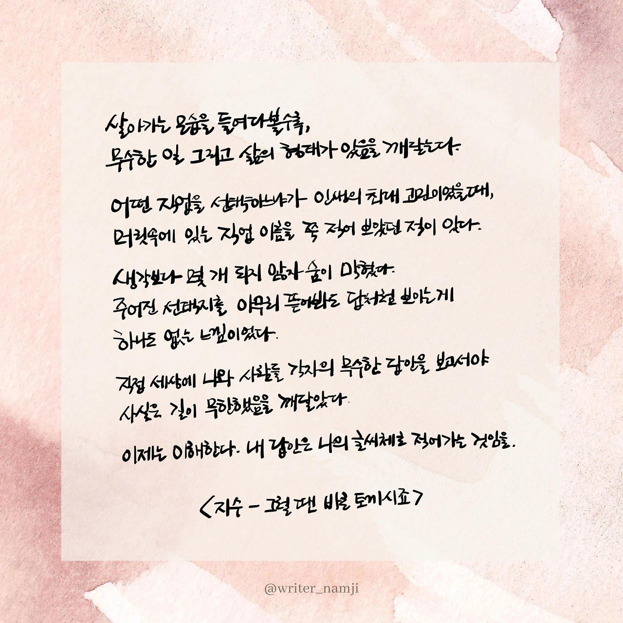 직접 세상에 나와 사람들 각자의 무수한 답안을 보고서야 사실은 길이 무한했음을 깨달았다. 이제는 이해한다. 내 답안은 나의 글씨체로 적어가는 것임을.