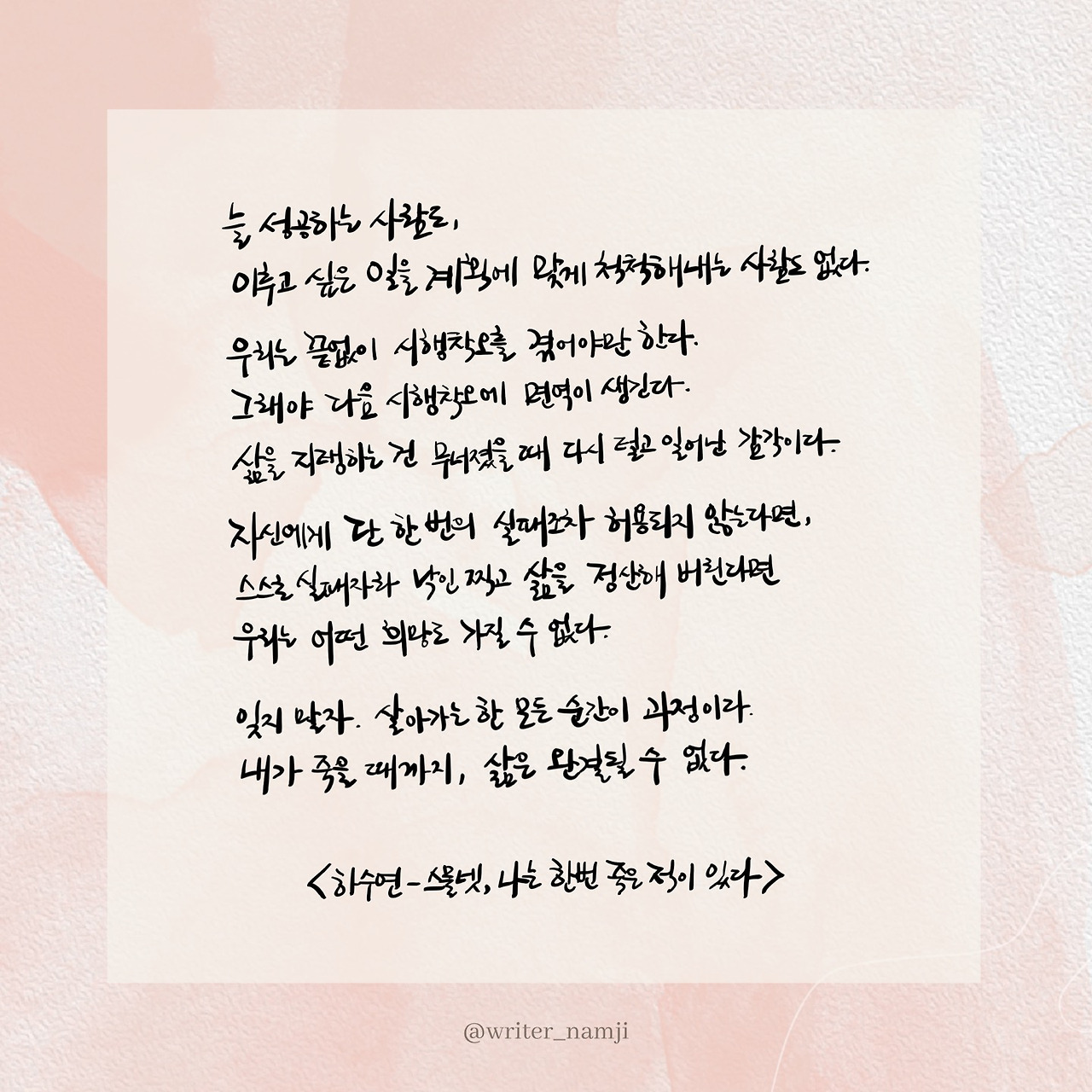 자신에게 단 한 번의 실패조차 허용하지 않는다면, 스스로 실패자라 낙인 찍고 삶을 정산해 버린다면 우리는 어떤 희망도 가질 수 없다. 잊지 말자. 살아가는 한 모든 순간이 과정이다. 내가 죽을 때까지, 삶은 완결될 수 없다.