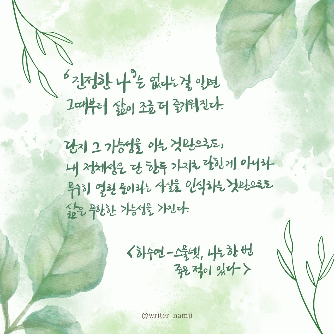 '진정한 나'는 없다는 것을 알면 그때부터 삶이 조금 더 즐거워진다. 단지 그 가능성을 아는 것만으로도, 내 정체성은 단 한두 가지로 닫힌게 아니라 무수히 열린 문이라는 사실을 인식하는 것만으로도 삶은 무한한 가능성을 가진다.