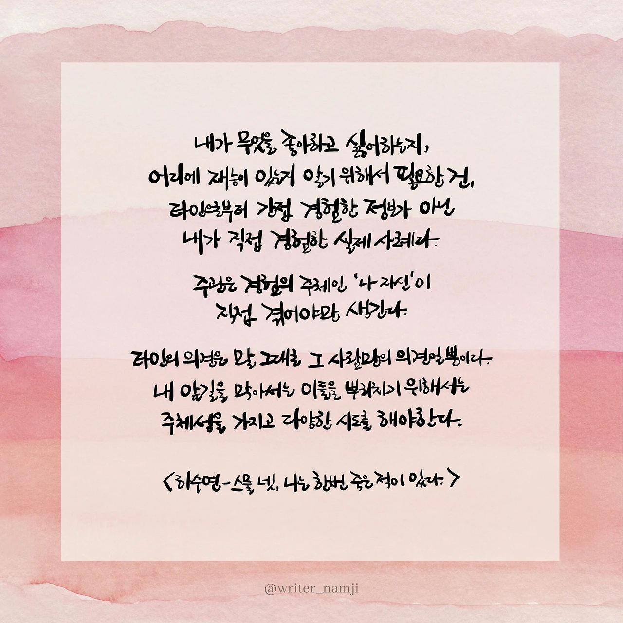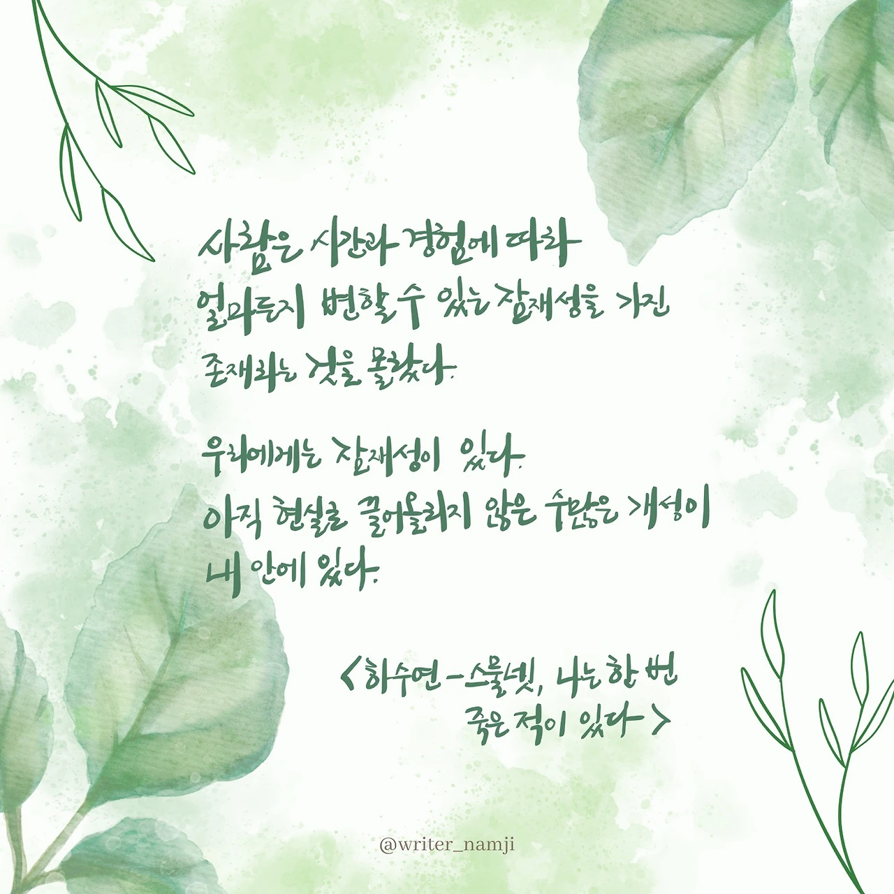 사람은 시간과 경험에 따라 얼마든지 변할 수 있는 잠재성을 가진 존재라는 것을 몰랐다. 우리에게는 잠재성이 있다. 아직 현실로 끌어올리지 않은 수많은 개성이 내 안에 있다.