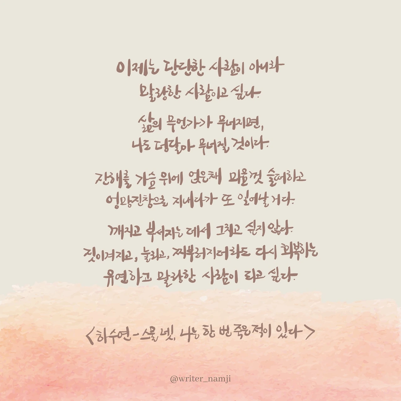이제는 단단한 사람이 아니라 말랑한 사람이고 싶다. 삶의 무언가가 무너지면, 나도 덩달아 무너질 것이다. 잔해를 가슴 위에 얹은채 마음껏 슬퍼하고 엉망진창으로 지내다가 또 일어날 거다. 깨지고 부서지는 데서 그치고 싶지 않다. 짓이겨지고, 눌리고, 찌뿌러지더라도 다시 회복하는 유연하고 말랑한 사람이 되고 싶다.
