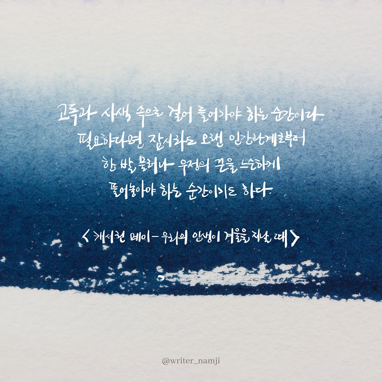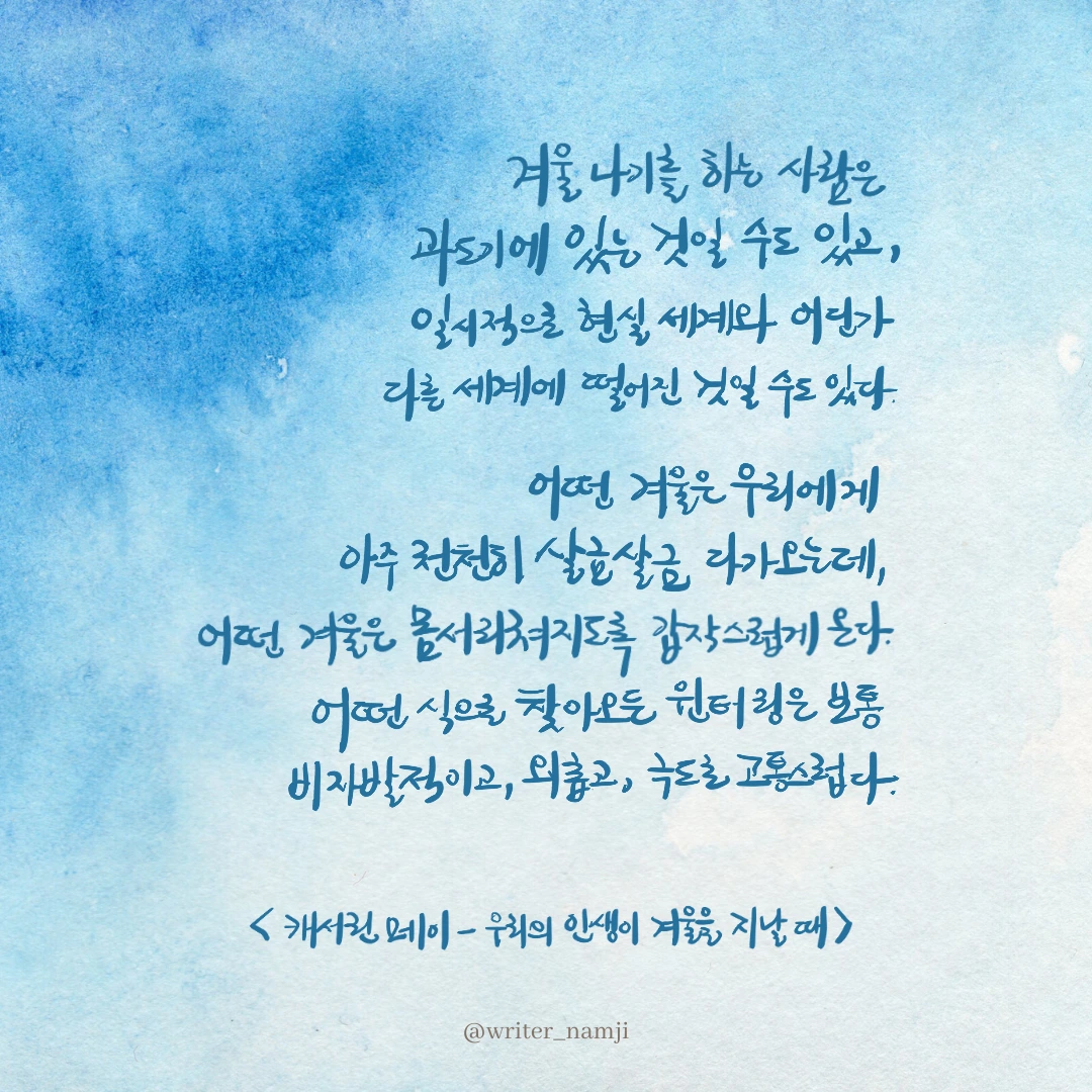 하루 종일 초점 없는 눈으로 세상을 바라보다가, 문득 내가 지금 겨울을 지나고 있음을 느낄 때가 있다. 무엇을 해도 채워지지 않는 마음은 헛헛하기만 하고, 그 인생을 바라볼 때면 외로운 마음이 들기도 한다. 이 겨울을 어떻게 이겨내는 것이 좋을까. 사실 나는 어떠한 노력도 하지 않은 채 그저 멍하니 하루를 살아가고 있다.