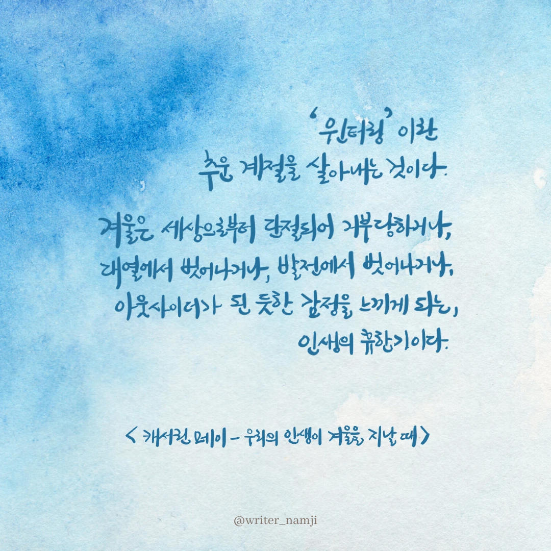 내가 생각하는 '겨울'의 정의에 관해 물어온 사람이 있었다. 나는 그에게 좋아하던 일이 더 이상 신나지 않을 때, 하루를 멍하니 의미 없이 보낼 때라고 답했다. 그 대답을 들은 그는 나에게 '의외네.'라고 말했다. 그래서 나는 그에게 그가 생각하는 '겨울'은 무엇인지 물었다. 그러자 그는 "다른 사람에게 혼이 날 때"라고 말했다. 나는 다른 사람과 겪는 일보다는 내 마음이 공허하고 의미를 찾지 못할 때라고 생각하였는데, 개개인의 사람마다 느끼는 '겨울'의 정의가 다를 수도 있겠다고 생각했다.