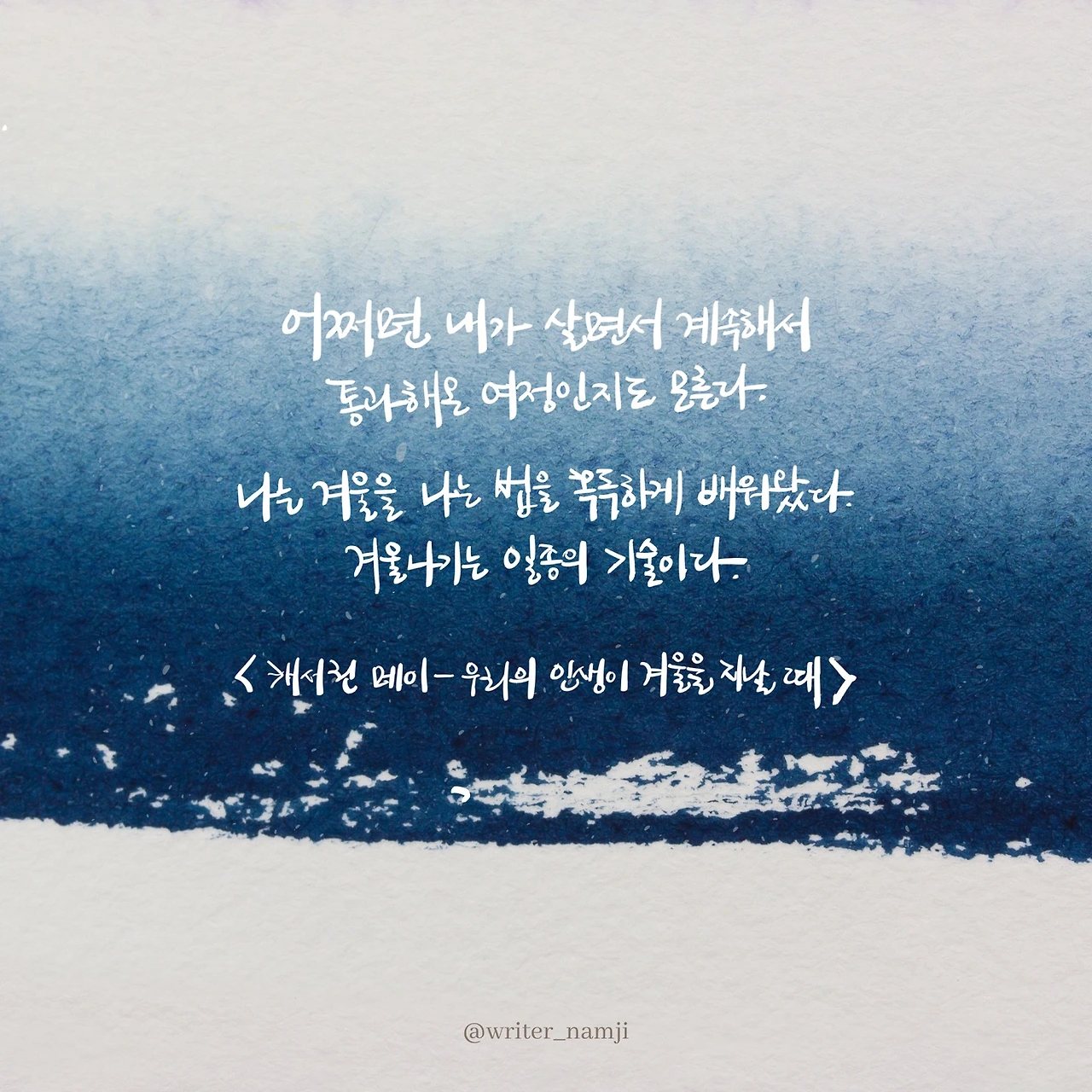 지금 여기에 나의 겨울이 왔다. 겨울은 내 삶을 보다 지속가능한 것으로 변화할 수 있도록 해주고 내가 초래한 혼돈을 통제할 수 있게 해주는 열린 초대다. 고독과 사색 속으로 걸어 들어가야 하는 순간이다. 필요하다면 잠시라도 오랜 인간관계로부터 한 발 물러나 우정의 끈을 느슨하게 풀어놓아야하는 순간이기도 하다. 어쩌면 내가 살면서 계속해서 통과해온 여정인지도 모른다. 나는 겨울을 나는 법을 혹독하게 배워왔다. 겨울나기는 일종의 기술이다.