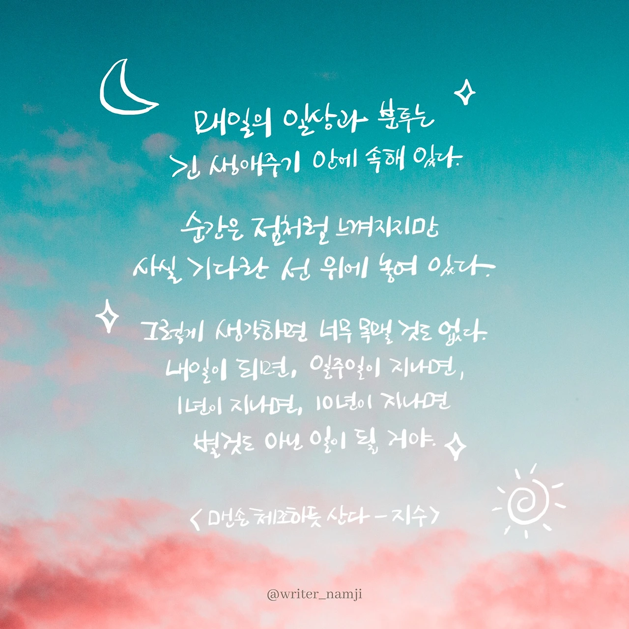 매일의 일상과 분투는 긴 생애주기 안에 속해있다. 순간은 점처럼 느껴지지만 사실 기다란 선위에 놓여 있다. 그렇게 생각하면 너무 목맬 것도 없다. 내일이 되면, 일주일이 지나면, 1년이 지나면, 10년이 지나면 별것도 아닌 일이 될 거야.