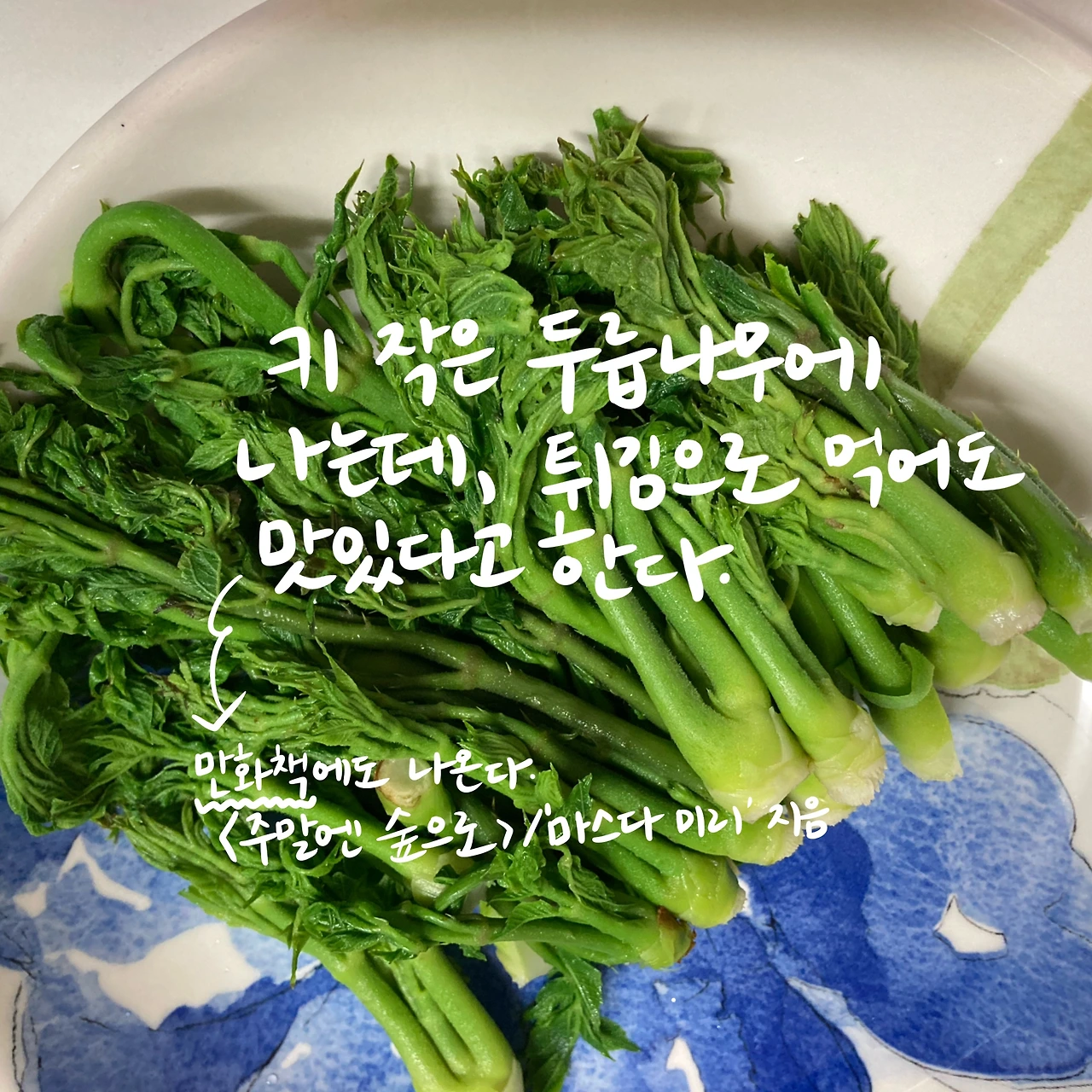 봄을 상징하는 나물 중 으뜸은 두릅이라고 생각한다. 산에서 걷다가 발견하곤 톡톡 뜯어다 먹는 상상을 하게된다. 책에서 봤을 뿐 그래본 적은 없다.