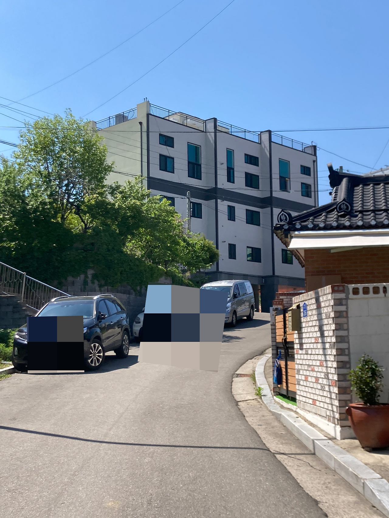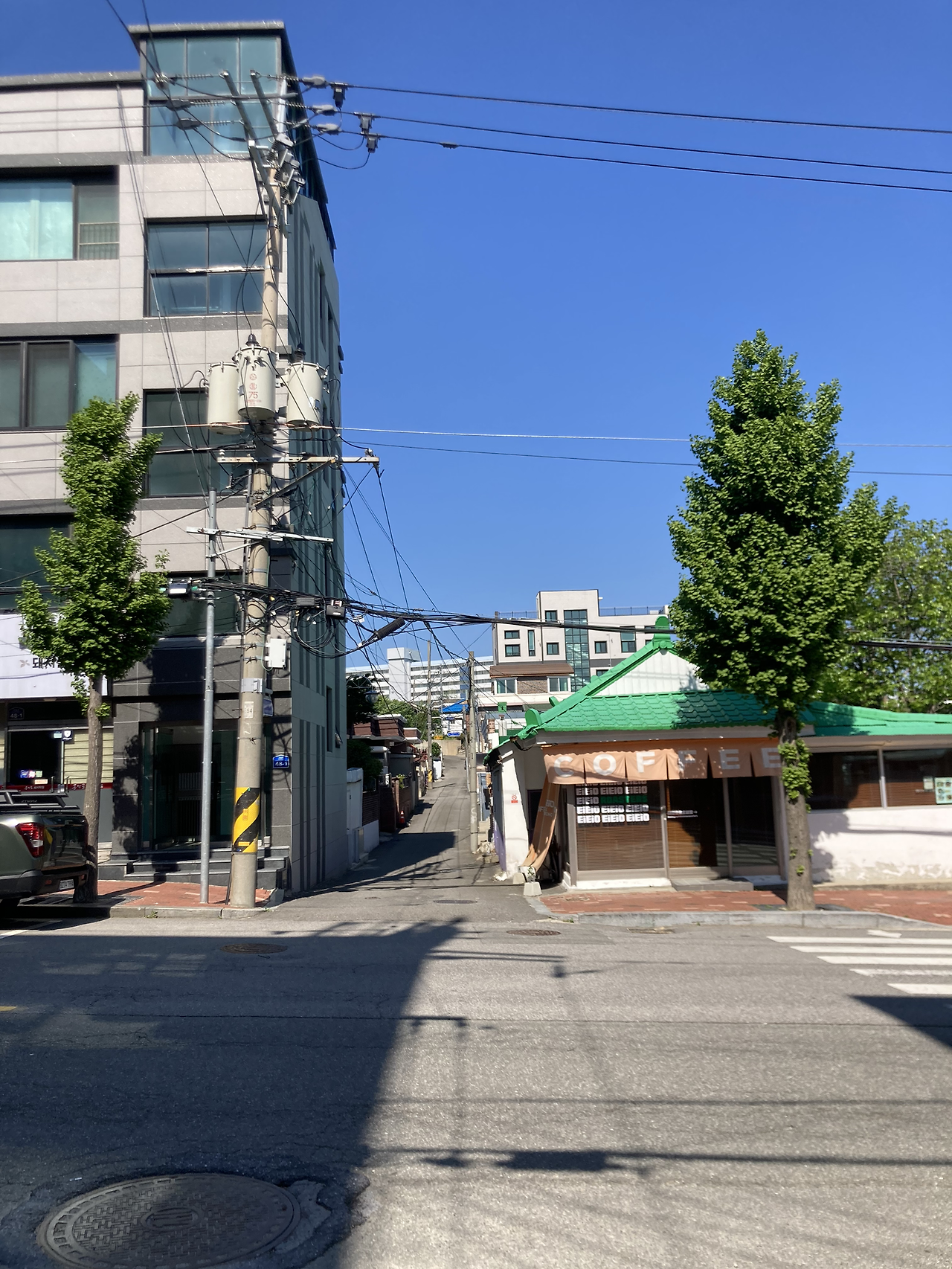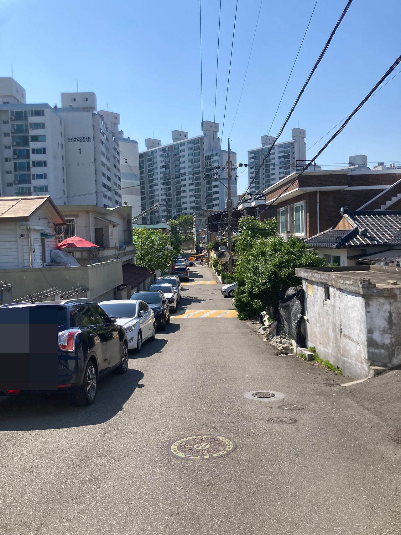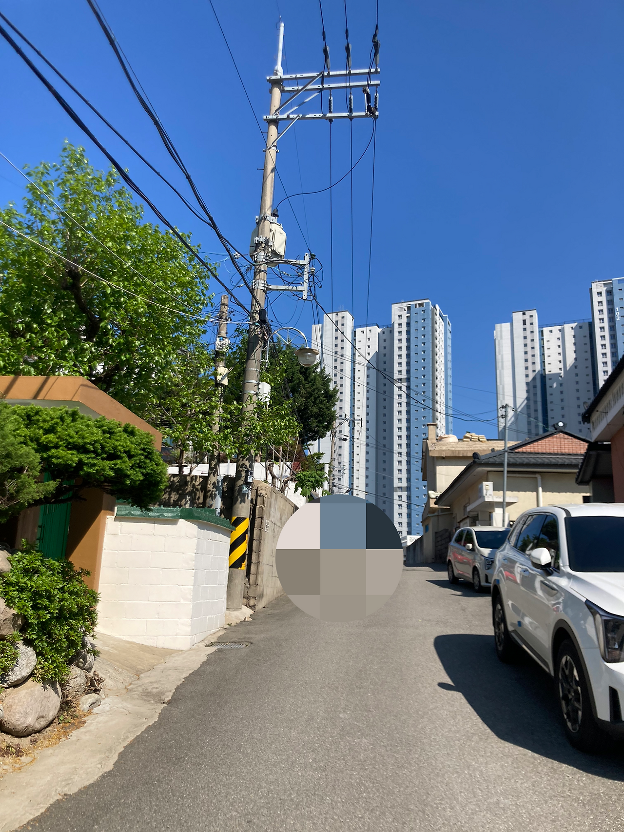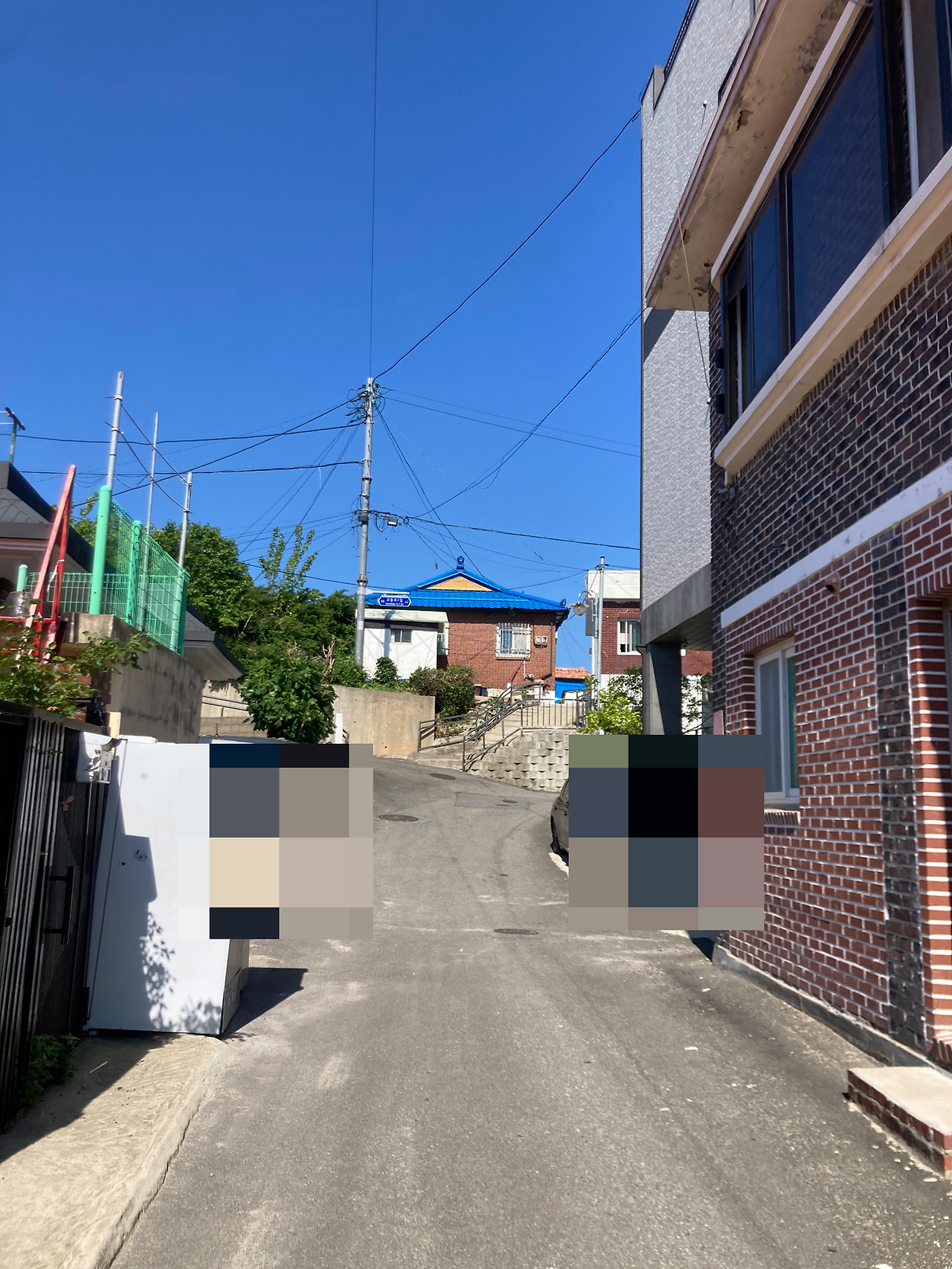 이쪽에선 나하나아파트 앞으로 지나는 게 낫겠다. 동네 사람들만 다니는 좁은 흙길을 지나 성당 뒤로, 성당에서 야쿠르트 사무실 찍고 청대산 자락이 보이는 주택가 언덕 위에 섰다.